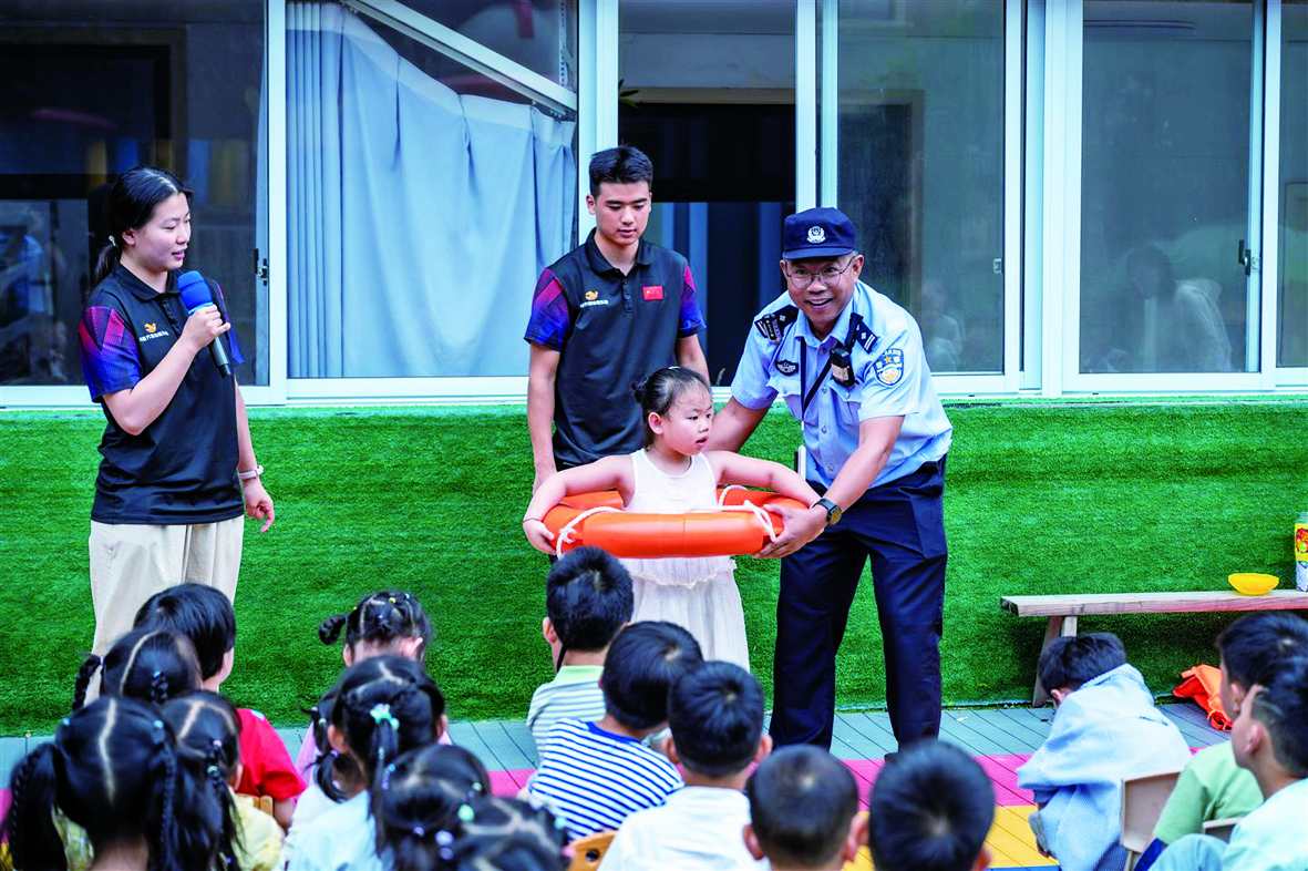 日前,金华市公安局江南分局秋滨派出所民警走进幼儿园开展防溺水安全宣传活动。民警通过现场讲解、模拟警情等形式提升孩子们的安全防范意识,确保他们安全度夏。 王雨佳 摄