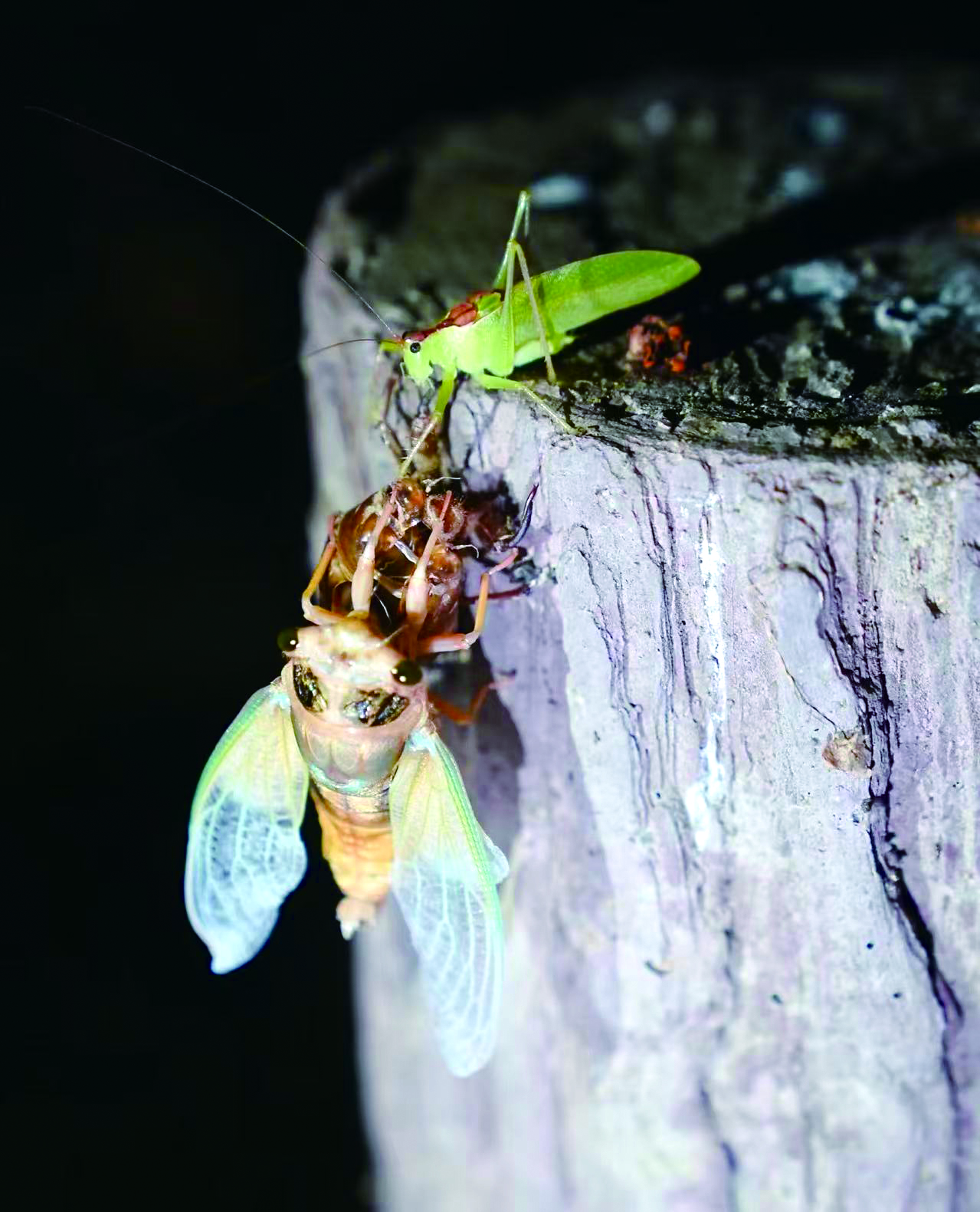 那么在金华,有哪些适合“夜探”的好去处呢?据介绍,燕尾洲公园、湖海塘公园南部以及双龙溪峡谷等地,都是不错的选择。“去年夏天,我带孩子在燕尾洲公园‘夜探’时就遇见了蝉蜕壳羽化。” 钱增说,蝉从土里钻出来,爬到树上,从壳中间开条缝,蝉就慢慢从中出来了,最后展开双翅,整个羽化过程大概需要30分钟。“刚钻出壳的蝉翅膀非常软,带着淡淡的绿色,非常漂亮。” 需要注意的是,如果你发现了正在羽化的蝉,请不要碰它,我们可以在一旁安静地看着,或者是拍照、拍延时小视频记录下这个神奇的过程。