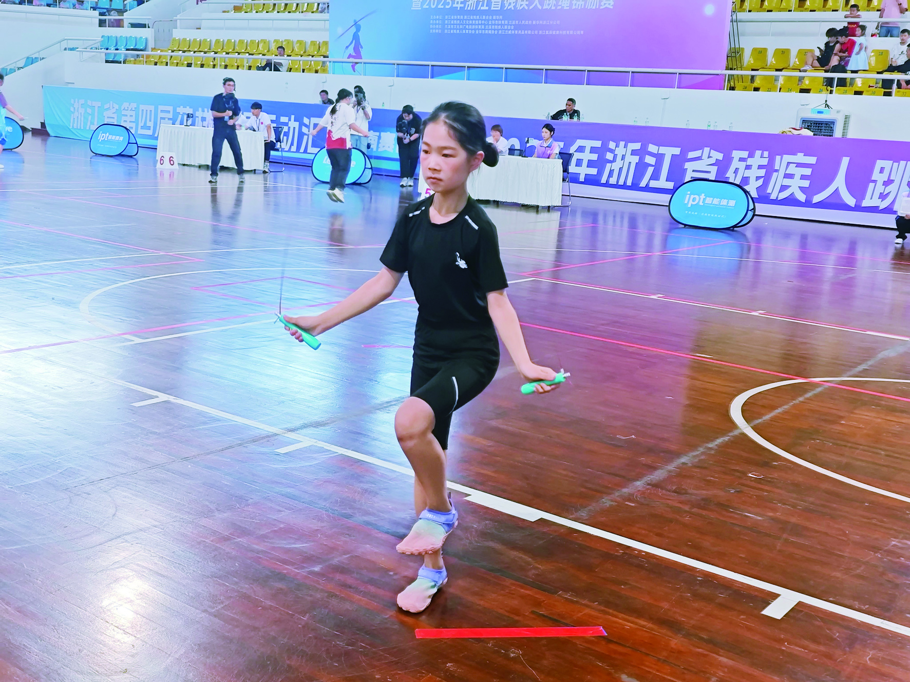 在近日举办的全国跳绳竞赛(兰溪站)和浙江省第四届花样跳绳运动会(浙南赛区)中,兰溪市马涧中心小学四年级的听障女孩方施珞依,以优异成绩分别摘得30秒单摇、1分钟单摇、3分钟单摇和个人花样等5个比赛项目的第一名。这位年仅12岁的小女孩,虽在无声世界里成长,却身残志坚,在赛场上跳出属于自己的精彩。