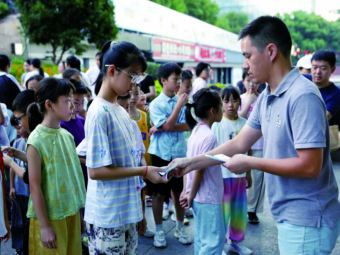 7月19日凌晨4点40分,虞众文来到市区人民广场。他组织的2025年暑假第五期公益性职业体验活动在这里举行,近100个孩子报名参加。签到、穿上统一的红马甲、领工具……孩子们当起小小环卫工,分区域忙碌起来,现场一派热火朝天的景象。