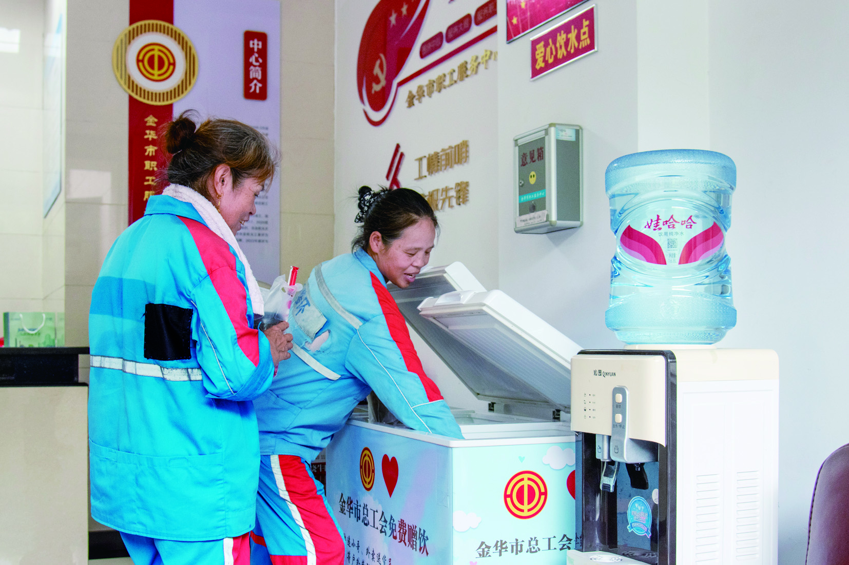 7月25日中午,市总工会爱心驿站里,环卫工人领取免费矿泉水解渴。 据了解,自7月7日起,市总工会开展“夏日送清凉”活动,工会爱心驿站每天为户外劳动者免费提供红豆汤、绿豆汤、银耳汤、矿泉水等消暑冷饮,让他们在炎炎夏日享清凉。截至目前,金华市已建成800余家工会爱心驿站。 本报记者 胡肖飞 文/摄