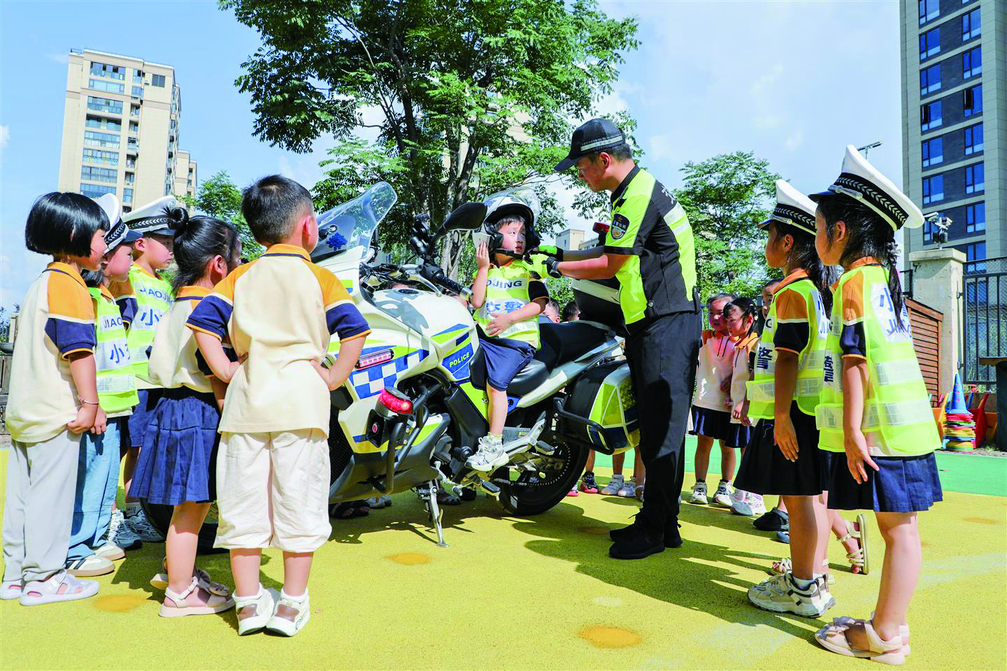 浦江县公安局交警大队针对不同年龄学生的认知能力和暑期出行特点,组织民警辅警走进校园,通过场景模拟、现场演示等互动方式,为孩子们普及交通安全知识,提升“知危险、会避险”的交通安全风险防范能力。 通讯员 杨晓东 摄