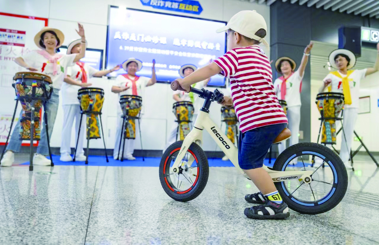 @大福:在轨道交通金华站的一场反诈宣传活动上,一个骑着小车的孩子被生动有趣节目吸引,在家长催促下仍不愿离开。 傅俊 摄