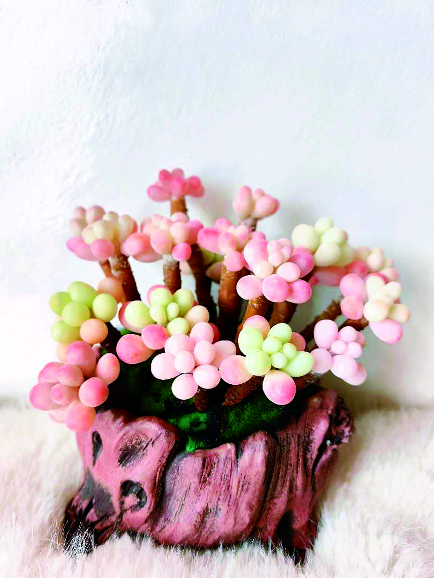 做好的仿真多肉,项钰芳还会根据其外观特点,用陶瓷、塑料、木质等花盆进行装饰,上面还加上苔藓和碎石,看起来更为逼真。
