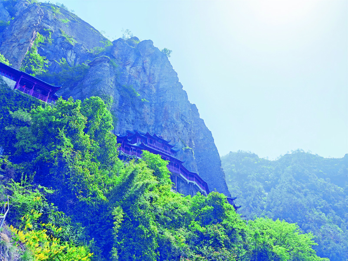 我们乘缆车攀升时,透过玻璃窗可见地藏王大殿如鹰巢嵌于崖壁。这座钢筋混凝土构建的现代寺观虽不及山西悬空寺古拙,但半嵌岩腹、半悬空中的结构仍令人屏息。