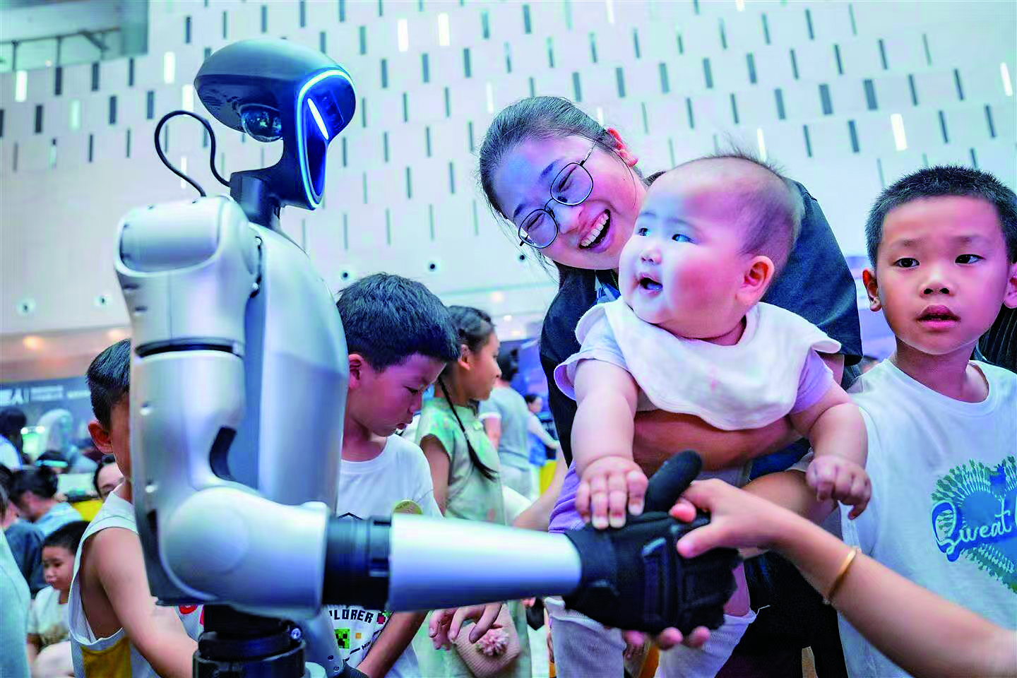 @夏雨:在一场AI智能机器人科普展上,几个月大的宝宝满脸好奇地与宇树人形机器人第一次亲密接触,互动画面十分有趣。傅俊 摄