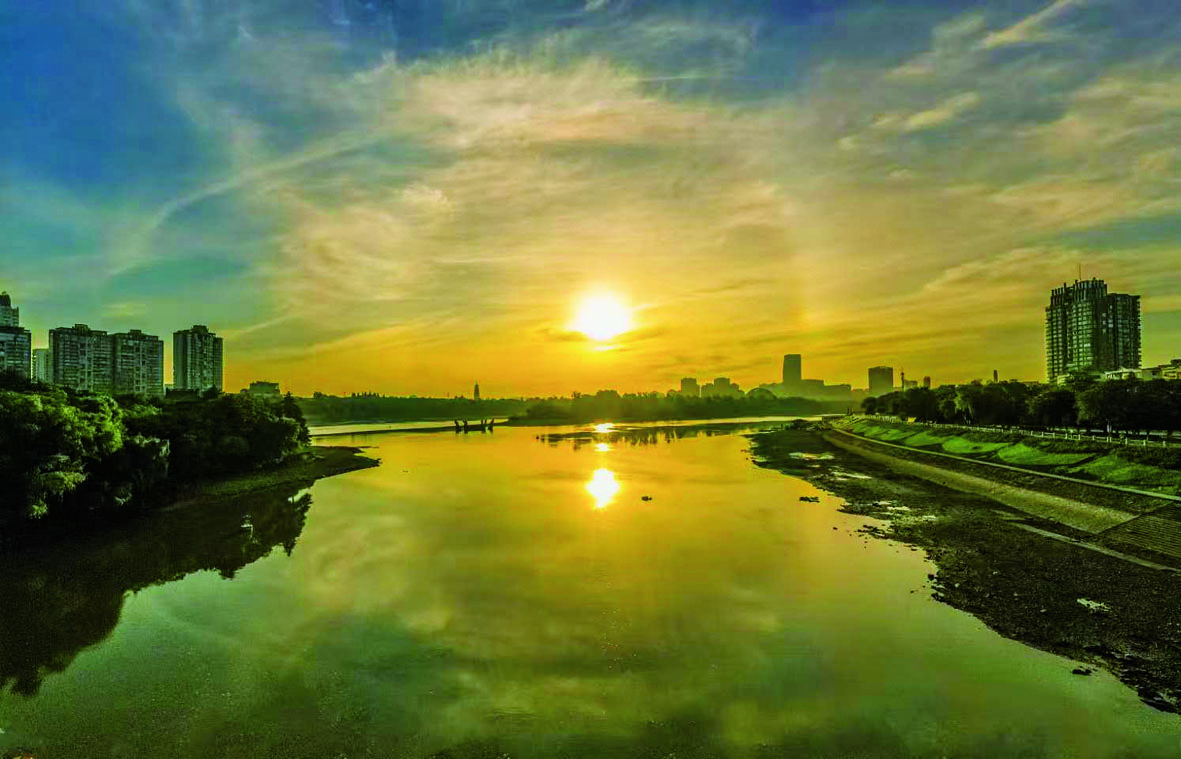8月7日凌晨5时15分,许毓坚像往常一样,去婺江边拍朝霞,但是当天的朝霞并不是很理想,6时左右,他忽然看到太阳的边上有一个巨大的光环,在这个光环的映衬下,整座城市都变得很美。于是,他将这美景记录了下来。6时20分,这个光环消失。