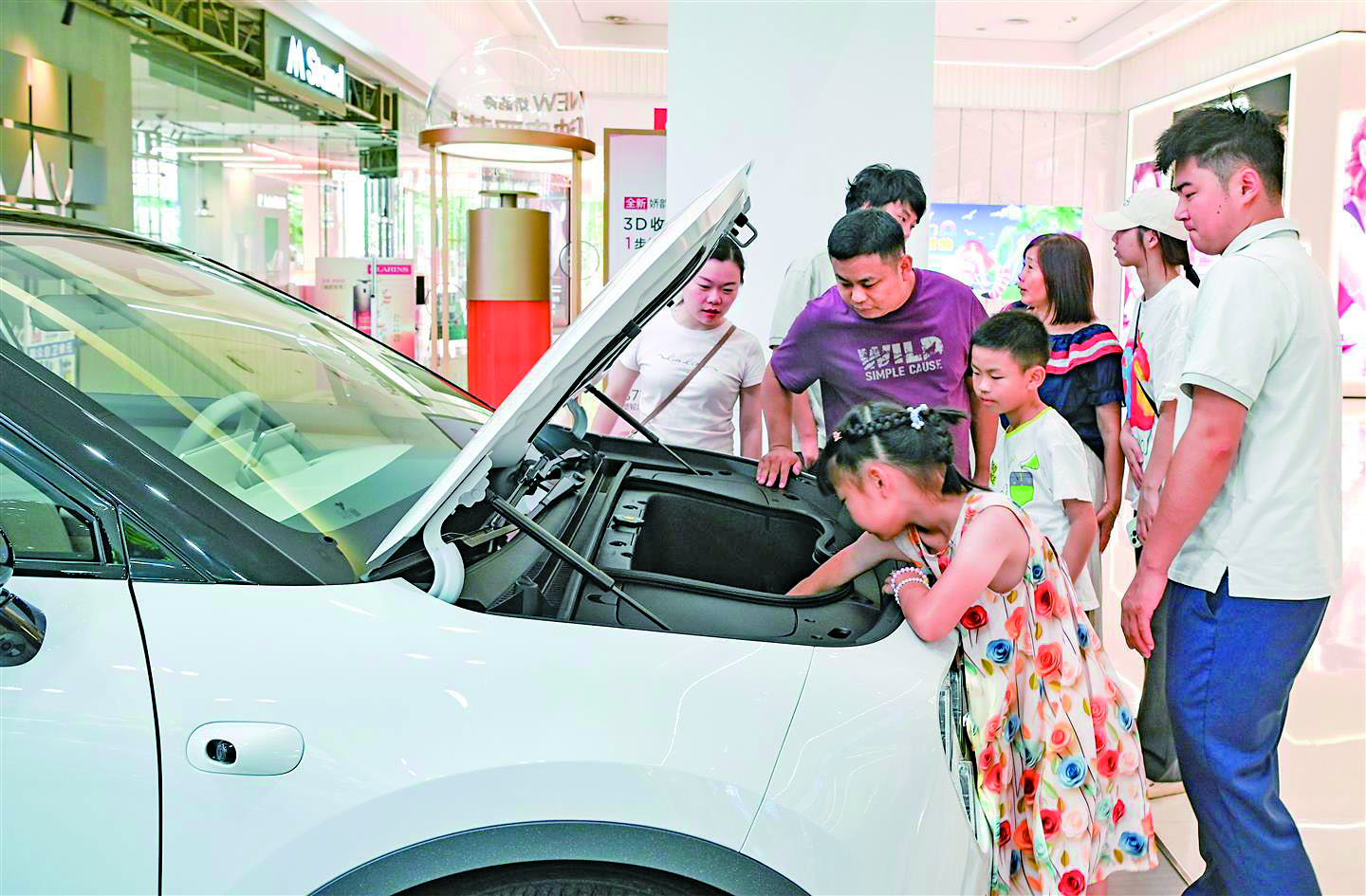 以往被珠宝、美妆、潮牌占据的商场一层店铺,越来越多地成了新能源汽车的“秀场”。图为8月17日,市区一商场内的新能源汽车前,来体验、咨询、问价的消费者络绎不绝。 本报记者 李建林 文/摄