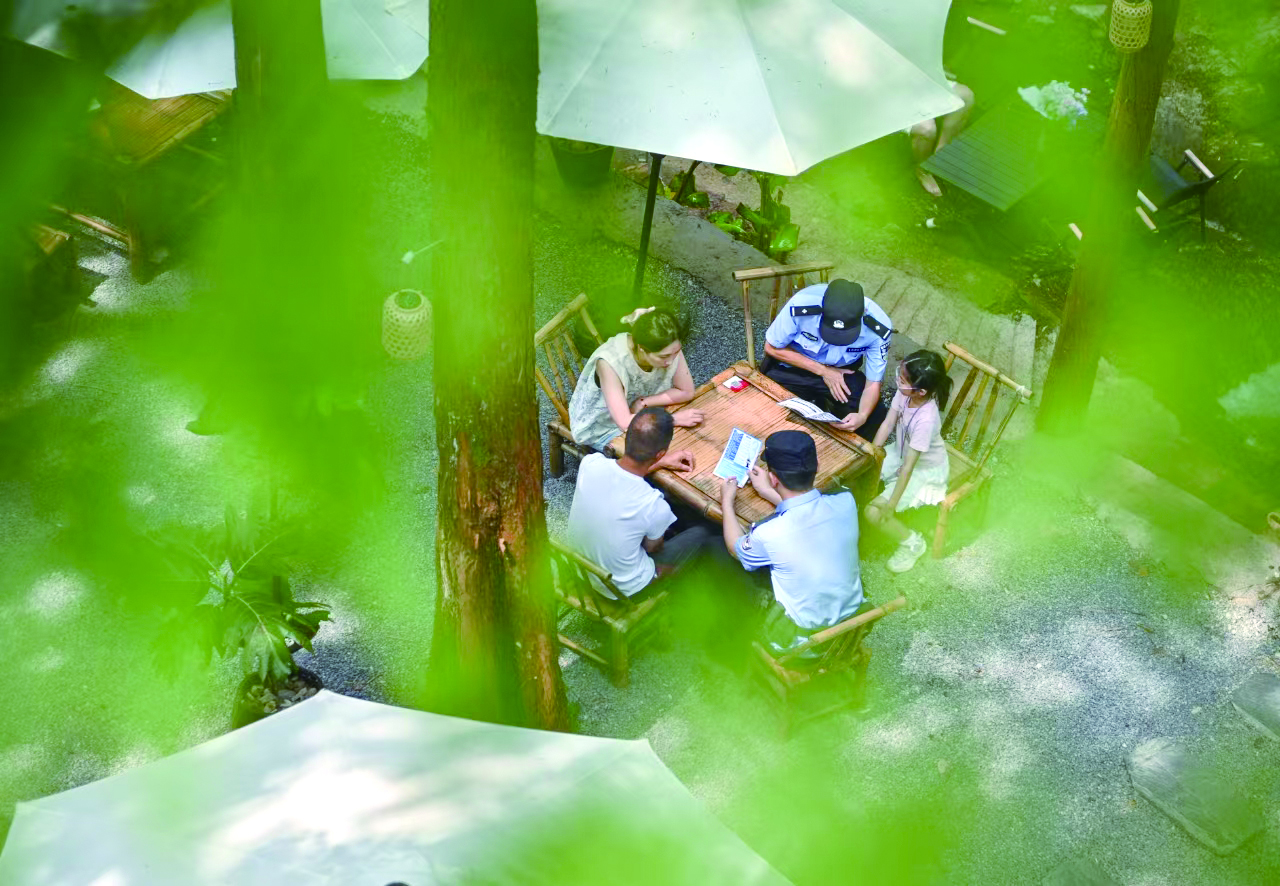 眼下正是水果成熟的旅游旺季,金华公安把安防宣传送进景区和果园。左图为武义县公安局王宅派出所民警在辖区避暑景点开展治安巡逻,向游客进行反诈等防范宣传,确保暑期旅游安全。上图为东阳市公安局虎鹿派出所民警辅警忙着走访果农,了解水果生长情况,开展防盗、反诈等安全知识宣传。