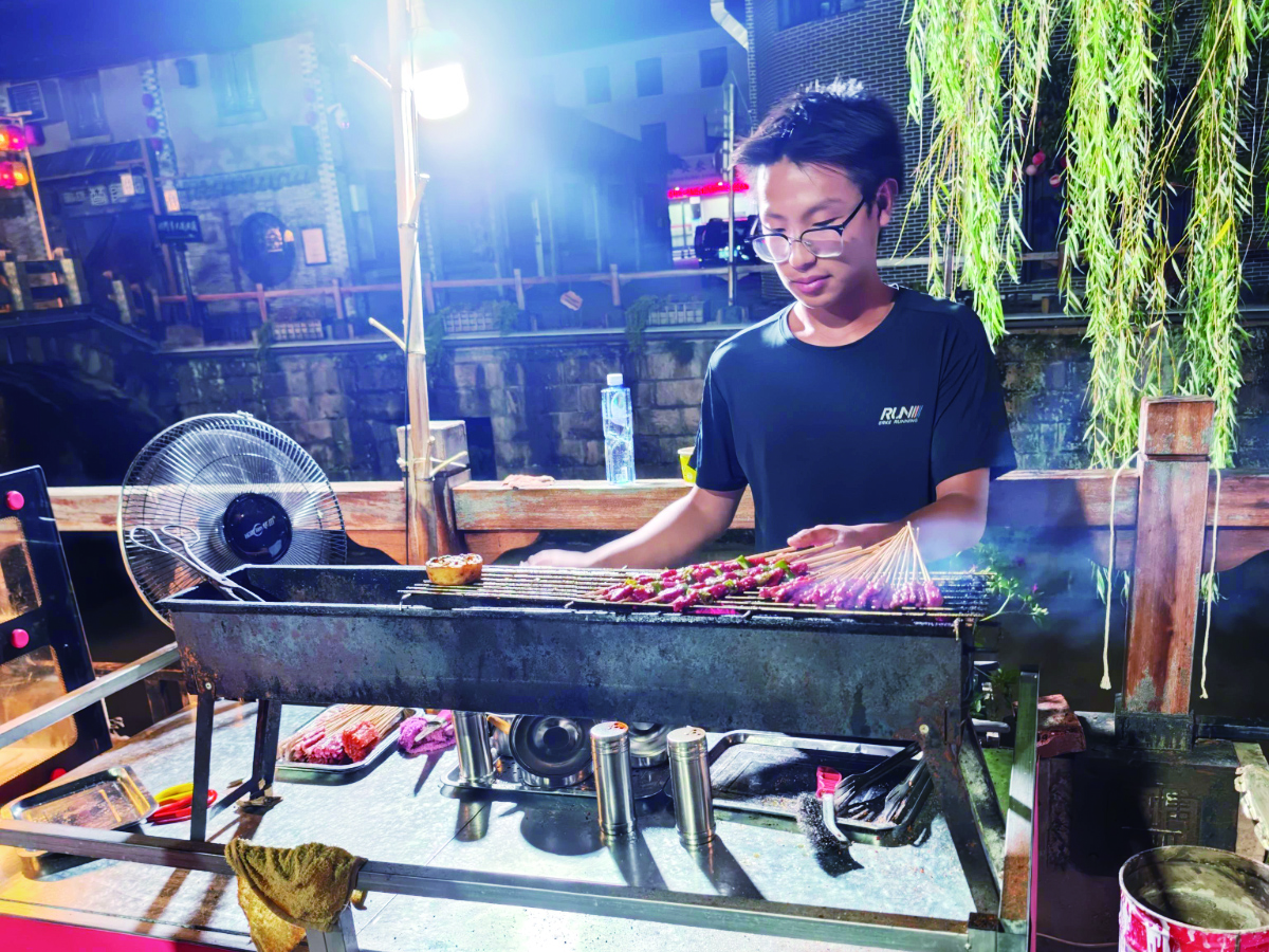 选择烧烤作为摆摊项目,源于羊奕杭从小对烧烤的喜爱。“家里经常烧烤,慢慢就学会了,后来想烤得更好吃,就在线上找教程学,还去别的摊点看人家怎么烤、尝味道找灵感。”羊奕杭表示,他还会主动询问朋友、家人和同学的口味偏好,根据大家的建议挑选食材,一点点优化自己的“菜单”。