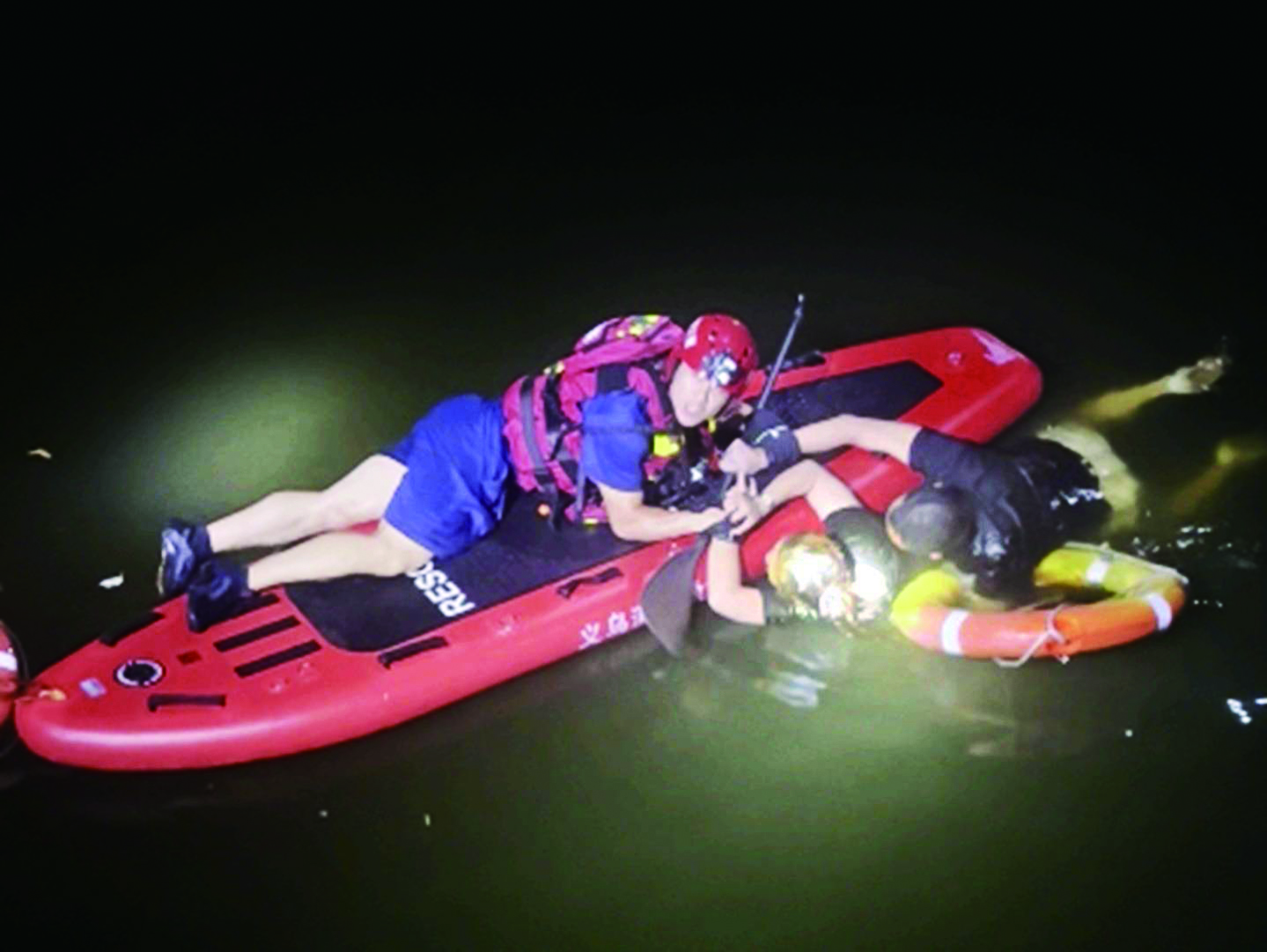 现场指挥员立即制定救援方案,调派水域救援专业队骨干从就近的江堤下水,展开桨板救援。