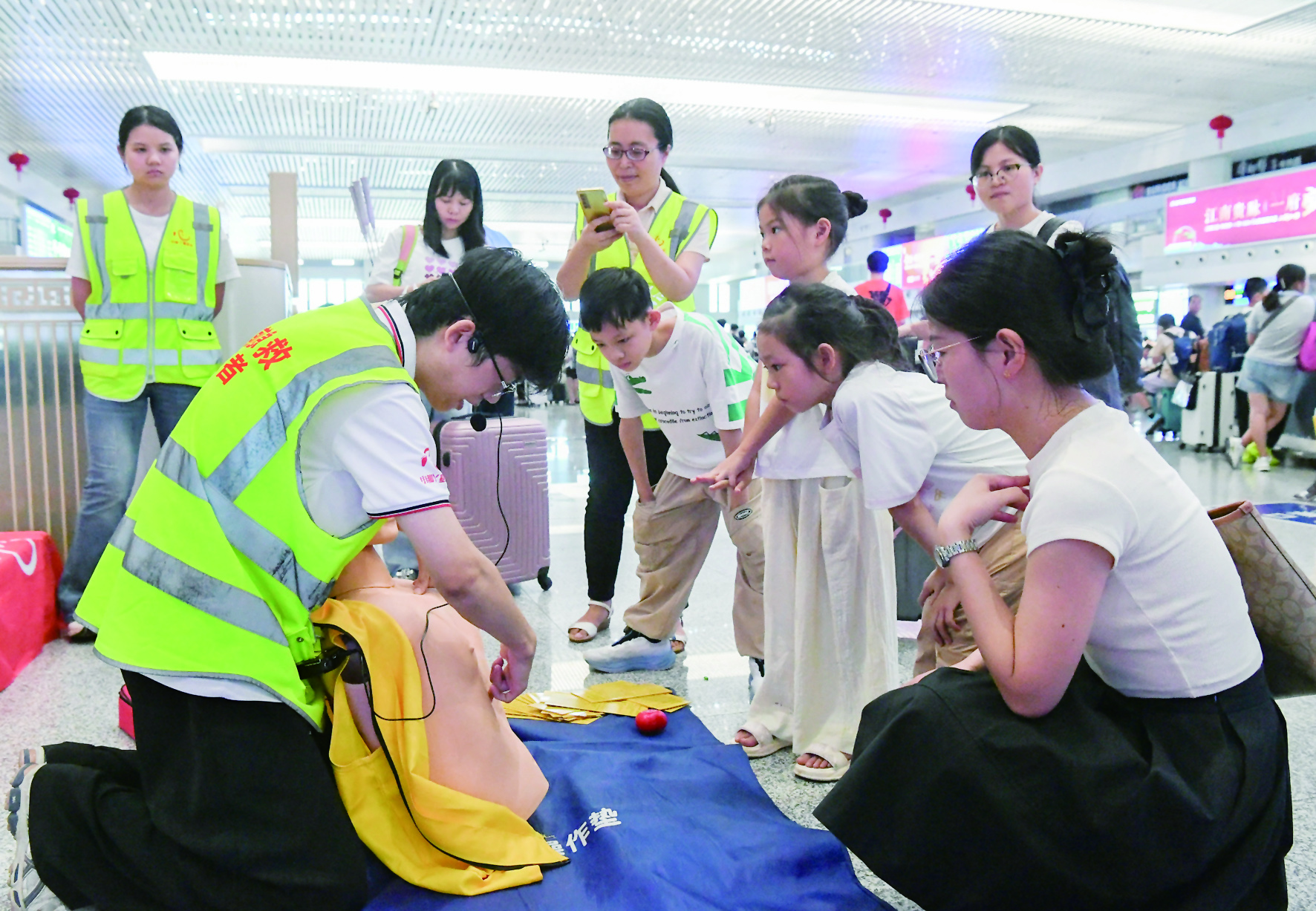 8月24日,在铁路金华站二楼候车大厅,市区小脚丫公益志愿者们利用自己的休息时间,向南来北往的旅客们手把手地传授海姆立克急救法、心肺复苏、心脏除颤仪使用等急救知识,吸引了不少旅客驻足学习,参与体验。 本报记者 时宽兵 文/摄