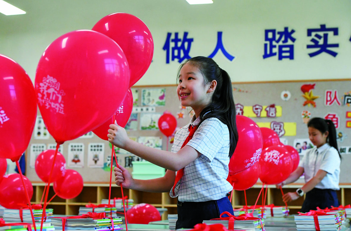 昨天,在婺城区一所小学里,师生们提早到校打扫环境卫生,把分发的新教材用红布带精心捆扎,用气球、彩条、剪纸等把教室布置得漂漂亮亮,为新学期开学做好准备工作。 本报记者 时宽兵 文/摄