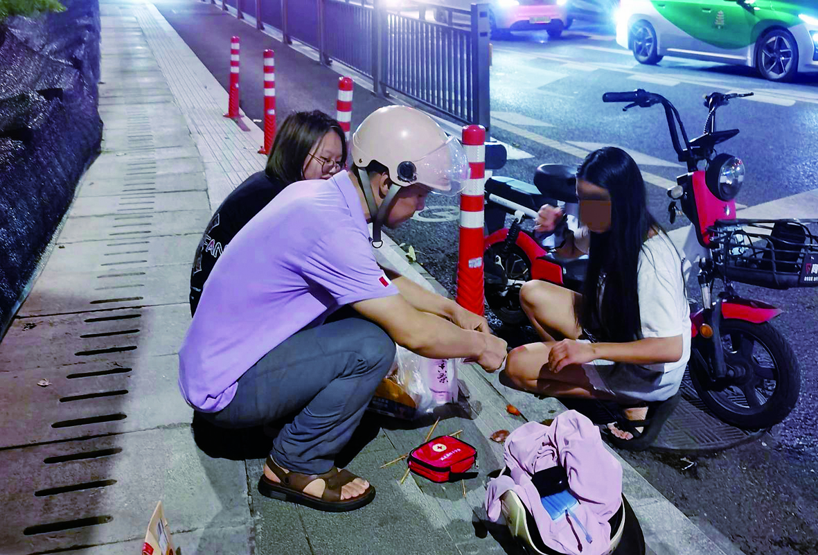 他发现,三辆电动自行车的驾驶人中有两位受了伤。为避免发生交通堵塞,造成二次事故,他在表明自己救护员的身份后,先帮他们将车子挪到了一边,并帮他们检查伤势。