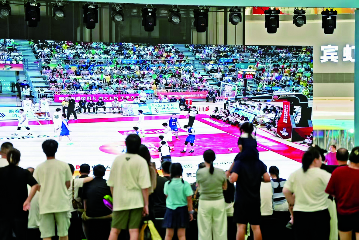 8月31日晚上,金华市区世贸城市广场中庭,时不时传来热烈的呐喊声——大屏上正直播“浙BA”比赛,吸引了不少市民驻足观看。 本报记者 金璐/文 陈斌/摄