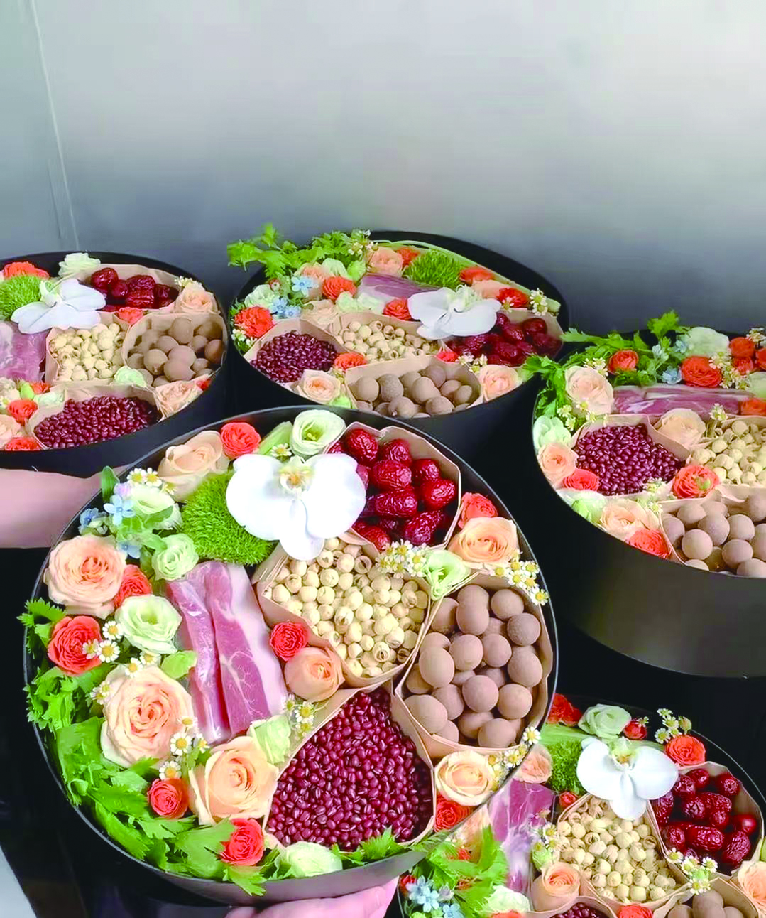 在市区另一家花店内,店主将“束脩之礼”鲜花礼盒放在了店铺的显眼位置,礼盒主要由桂圆、红枣、红豆、莲子、芹菜、牛肉干和鲜花组成,售价145元。“我在‘束脩六礼’的基础上,又加入了向日葵,寓意蒸蒸日上,大家会比较喜欢。”店主傅女士说,束脩这一古代礼仪在互联网的推动下焕发新生,店铺去年首次尝试推出束脩礼盒意外地受到了市场的青睐,今年也早早就接到了预订的单子。和线下一样,记者查询线上平台发现,“束脩之礼”鲜花礼盒组成大多相似,在保留经典搭配芹菜的同时,商家针对新鲜猪肉不便携带的问题进行了改良,以真空包装的腊肉、香肠、火腿等作为替代,售价大多在200元上下。