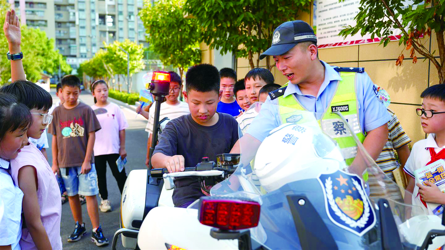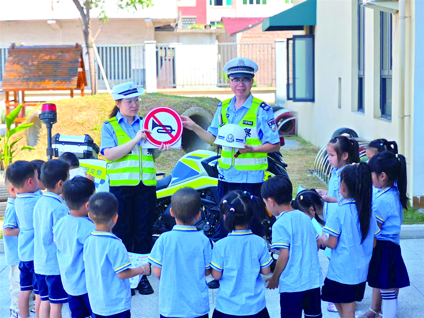 为全力筑牢校园交通安全防线,永康市公安局交警大队组织各路面中队维护学校区域道路交通秩序、护航学生上下学安全,并组织警力走进课堂,为孩子们上了绘声绘色的“开学安全第一课”,全方位为新学期校园交通安全浇筑坚实屏障。 黄莹莹 摄