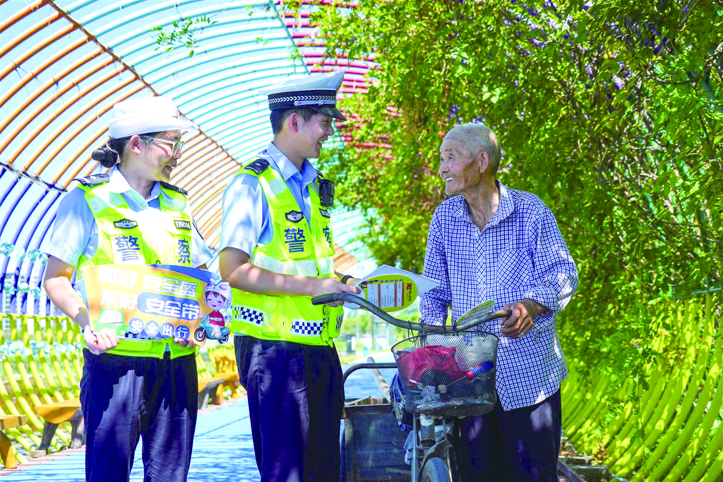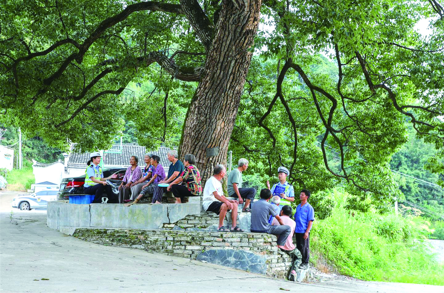为提升农村老年群体的交通安全出行意识和自我防护能力,浦江县公安局交警大队组织民警辅警走村串户,通过面对面的方式,把安全知识送到老年村民身边。图为浦江交警在郑宅镇湖顶村村口向村民传授交通安全知识。 杨晓东 摄