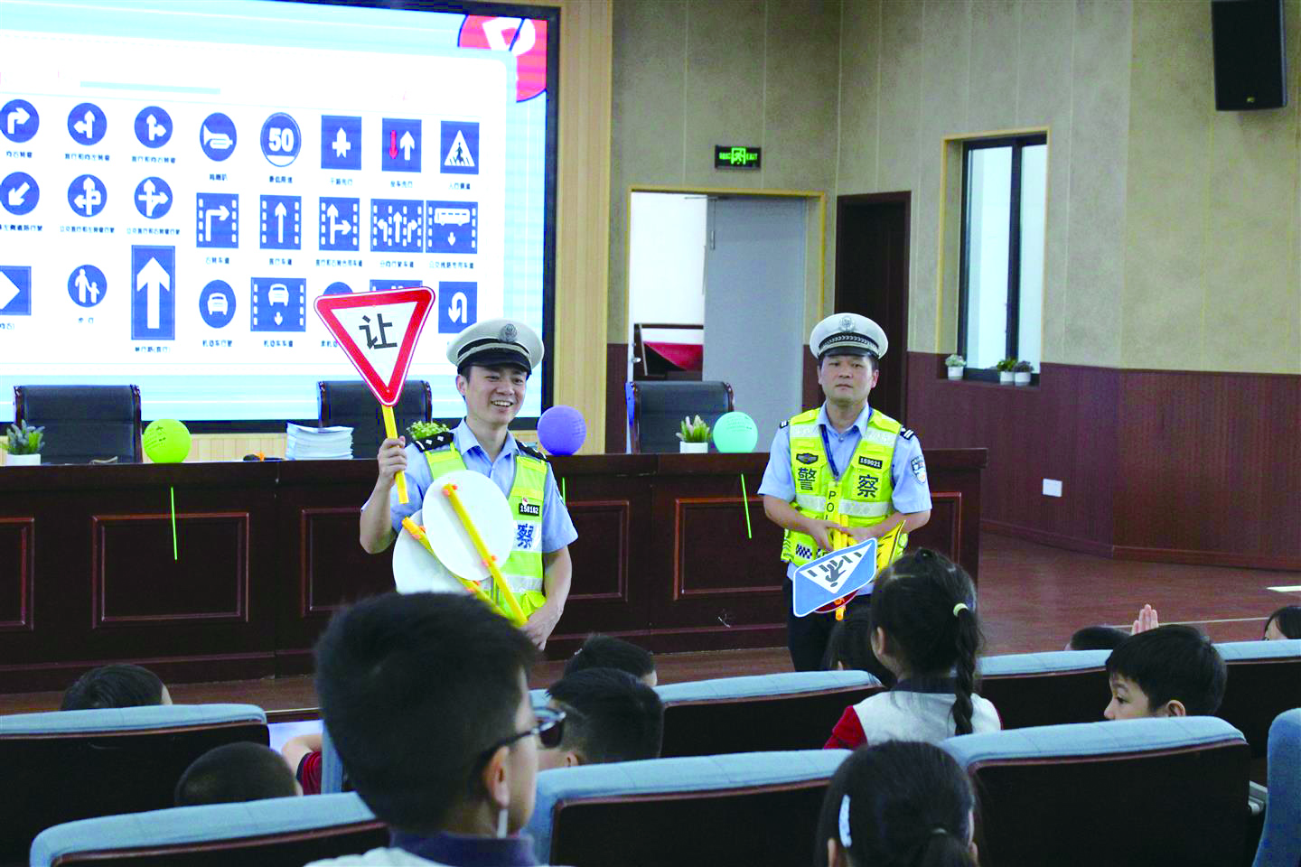 东阳市公安局交警大队组织警力深入辖区各中小学校、幼儿园,开展内容丰富多彩的“开学第一课”主题宣传活动。图为民警通过现场教学,用通俗易懂的语言带领孩子们学习常见交通标志等交通知识。 朱晓伟 摄