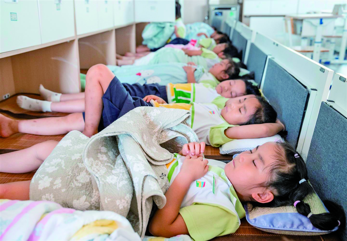 昨天中午,在金华市志和小学一二年级教室里,吃完午饭的学生们准备好毯子,拉开教室靠墙四周的躺睡柜,开始午睡。该校教室四周的书包柜、收纳柜被改造成“躺睡”柜,打开的午睡床尺寸还根据低、中、高段孩子们的不同身高进行了相应调整,一二年级1.6米、三四年级1.75米、五六年级1.9米,满足孩子生长发育需求。