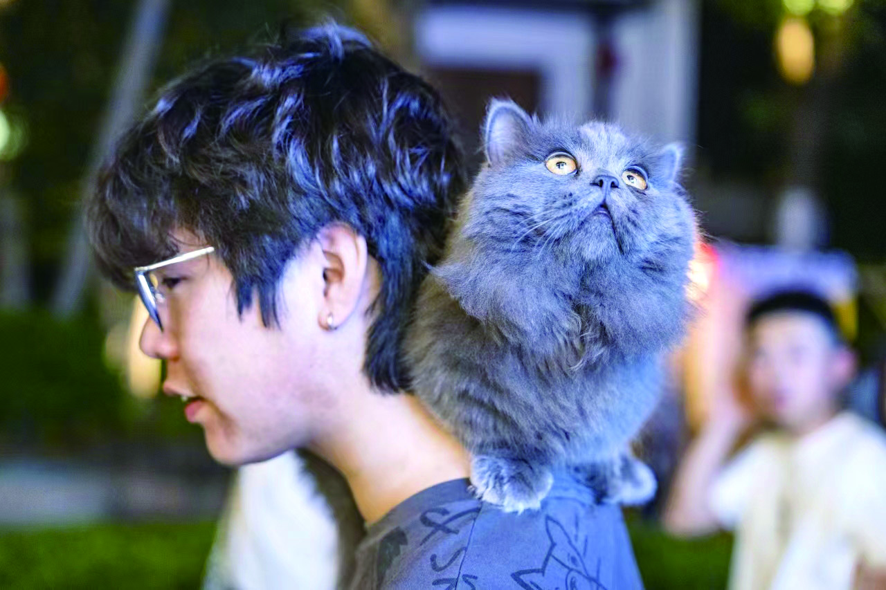 @萝莉:在市区一演出现场,年轻人带着自己的小猫来凑热闹。小猫静静地蹲在主人的肩膀上,睁大眼睛看着前方的演出。 傅俊 摄