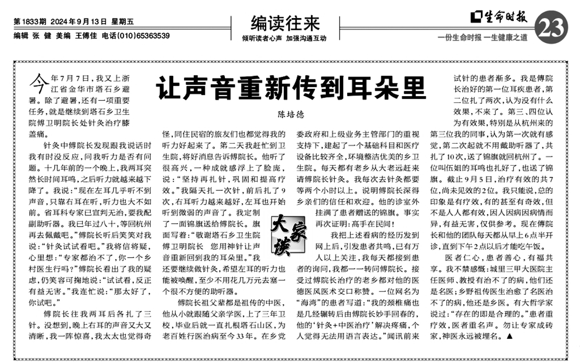 2024年9月13日,《生命时报》刊发题为《让声音重新传到耳朵里》的文章,陈培德在文中讲述了自己在塔石乡的治病故事。