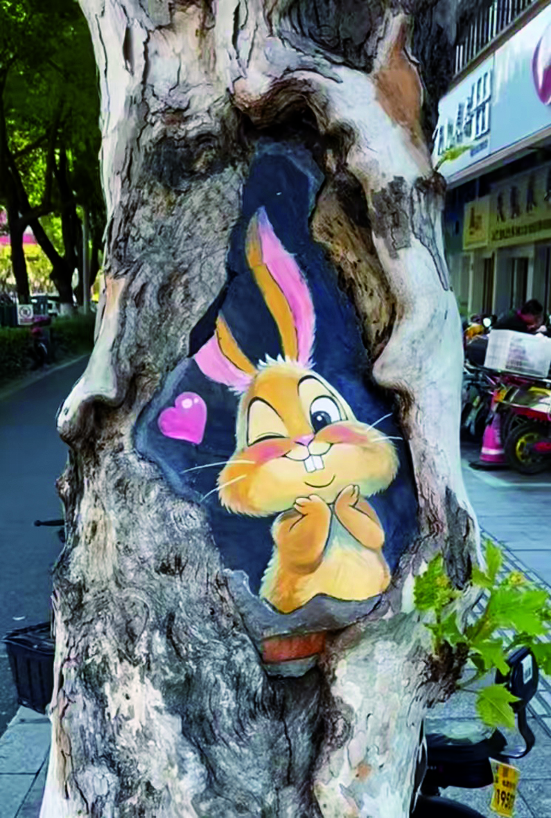 等颜料寄到家后,父子俩立即带着绘画所需的物料,找到金华市双溪实验学校门口的那棵行道树。两人把树洞上的水泥块擦洗干净后,在上面画了一只卡通兔。只见小兔子露出两颗白白的牙齿,俏皮地闭上右眼,双手捧着萌萌的脸蛋,非常惹人喜爱。市民和路人纷纷驻足观看。