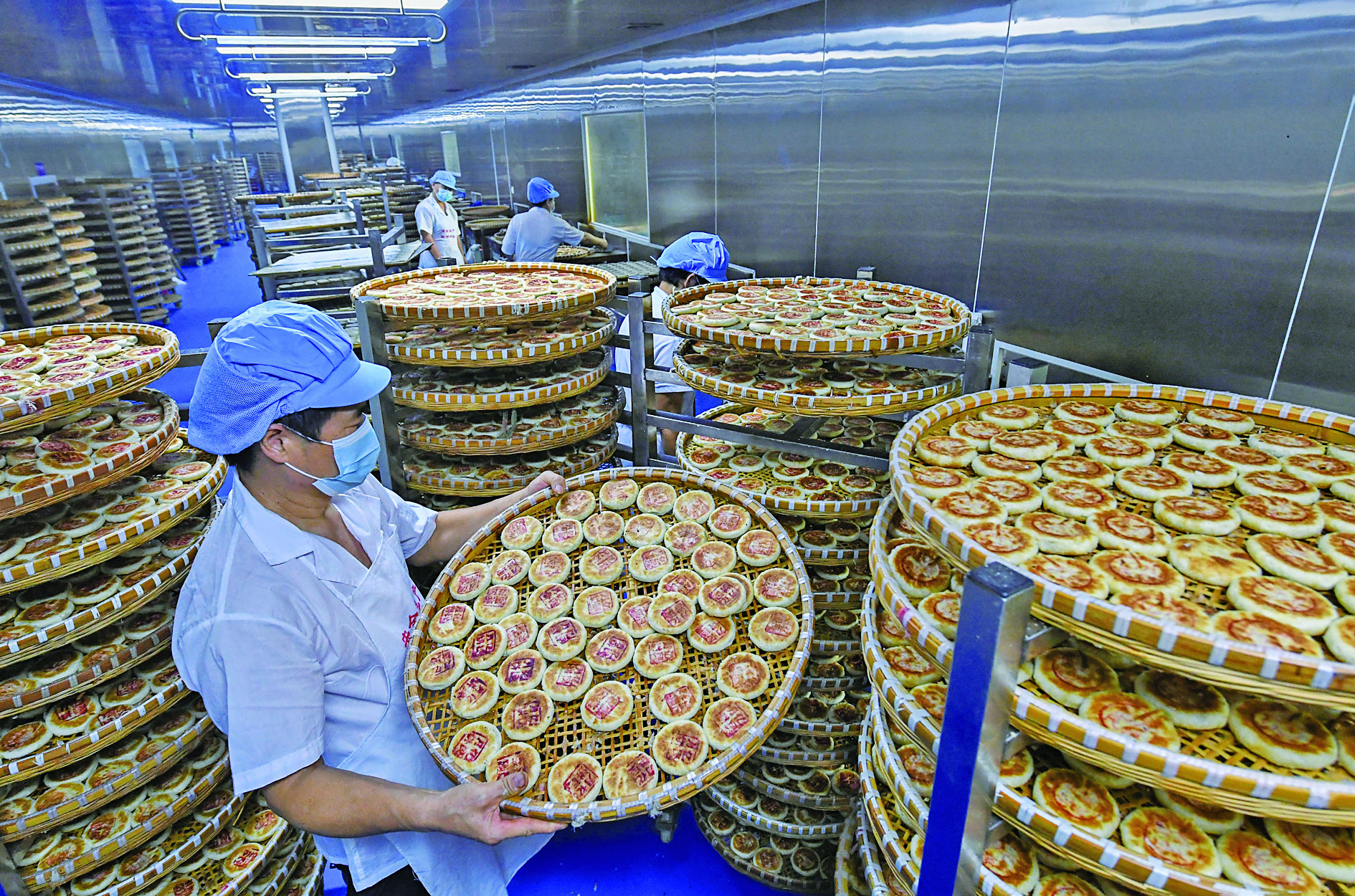 9月24日,在义乌市供销食品有限公司生产车间里,工人们正在加班加点赶制中秋月饼。随着中秋节的临近,这家“浙江老字号”月饼企业每天要生产核桃、五仁、椒盐、榴莲、黄精、铁皮石斛等20多个品种的月饼。 本报记者 时宽兵 文/摄