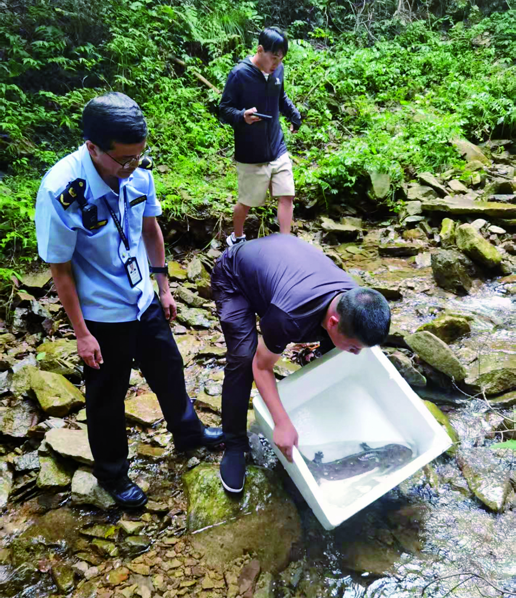 昨天,磐安县农业行政执法队在大盘山国家级自然保护区放生一只国家二级保护野生动物娃娃鱼,让它重回大自然怀抱。