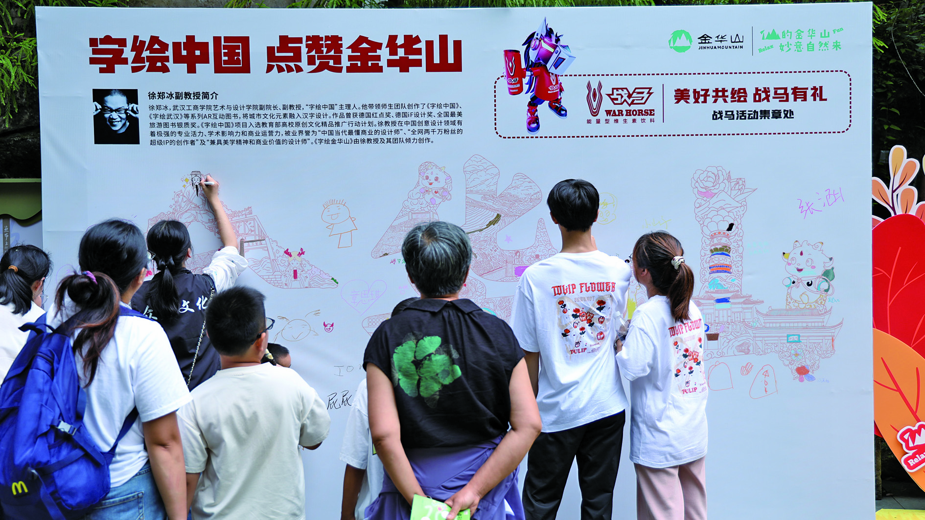 这处由杭州思拓锐文化创意有限公司牵头策划,武汉工商学院“字绘中国”团队创作的“字绘金华山”作品,正以汉字为载体,让金华山的自然奇观与人文底蕴成为年轻人争相合影的文化符号。“现在出游特别流行地标打卡,但很多打卡地缺少新意和文化感。”杭州思拓锐文化创意有限公司创意负责人李艳道出策划初衷。