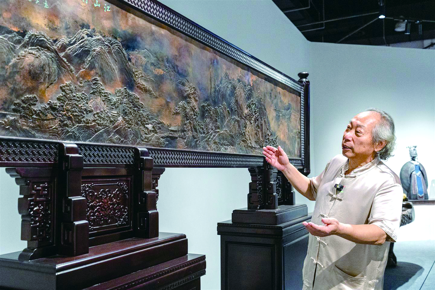 换下围裙,程育全来到展厅,第七届浙江工艺美术双年展上展出了他的两件作品。一件是紫铜镀金作品《江山行旅图》。一块平面铜板,经过一锤锤的敲打和一次次的煅烧,呈现出祖国大好山河图景,犹如一幅水墨画。画面中,山体嶙峋,青松矗立,亭台楼阁点缀其中。山中小道上,徒步者、下棋者、推车人等30多个人物刻画细腻,让人叹为观止。作品融入了錾刻的多种技法,作为创始人,程育全将之命名为“程育全铜雕”。