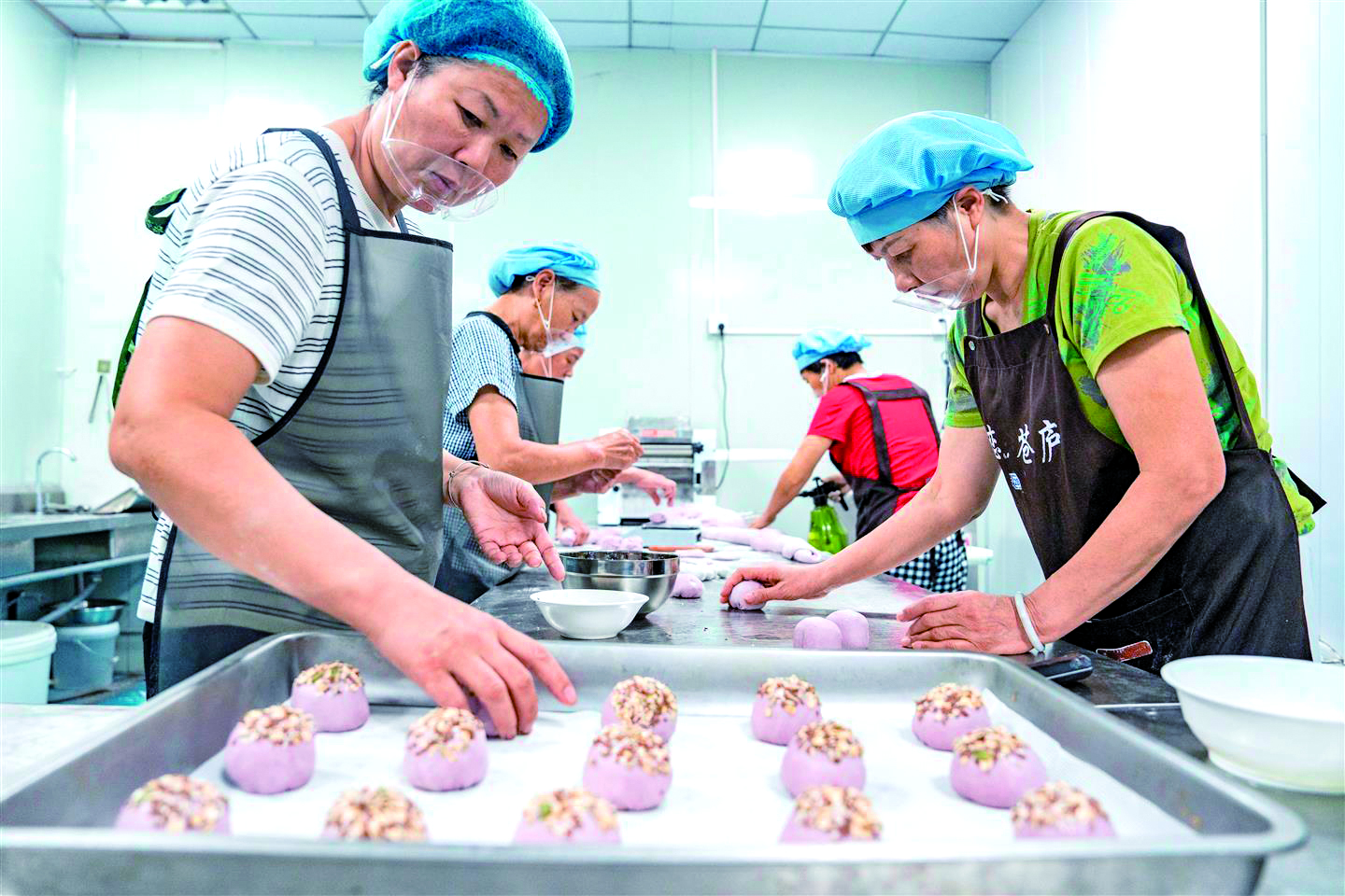 昨日,在琅琊镇一共富工坊内,工人们正忙着制作色彩缤纷的果蔬馒头。这些特色馒头热销,为村民提供稳定的就业岗位和收入来源。 本报记者 傅俊 文/摄
