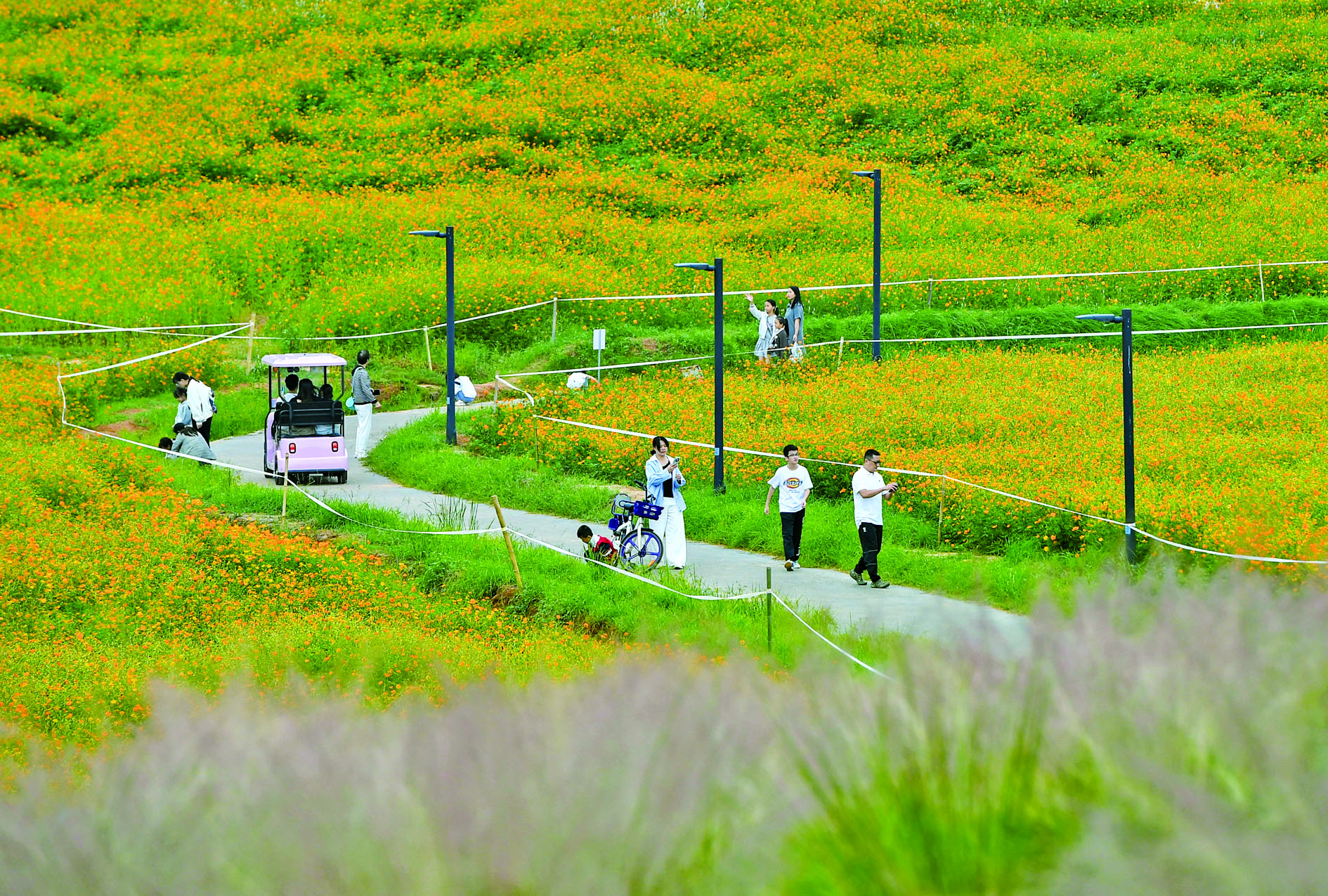昨天,金华一夜之间进入秋季。在义乌市植物园,向日葵、硫华菊、木芙蓉、粉黛乱子草等多种花草争奇斗艳,色彩斑斓,吸引众多市民趁着凉爽天气前往赏景游玩。 本报记者 时宽兵 文/摄