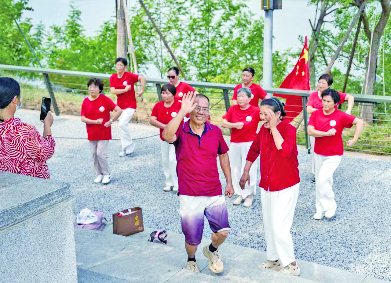 @有所乐:在市区婺剧文化公园里,一群老年人正在排练舞蹈。见有人拍照,大爷兴奋地一直挥手,急得一旁的阿姨笑着“鞭策”,让大爷认真排练。 傅俊 摄