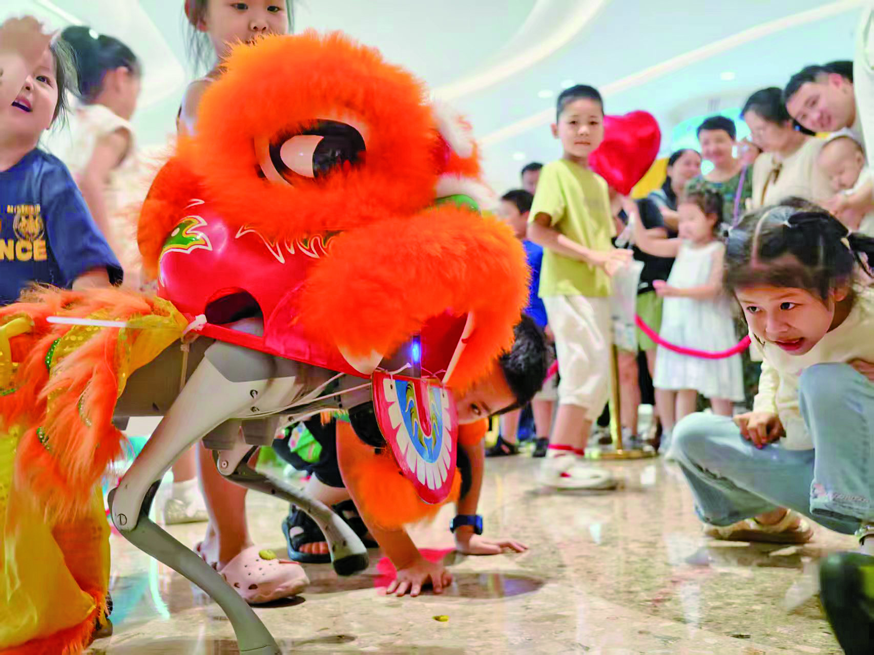 @绵绵冰:在市区一商场里,4只机器狗正在表演“舞狮”,吸引不少孩子驻足观看。 傅俊 摄