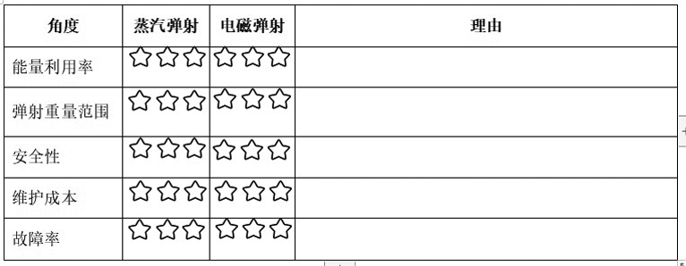 4.通过学习,请从能量利用率、可弹射飞机的重量范围、安全、维护成本、设备故障率等角度进行分析蒸汽弹射与电磁弹射的优缺点,给各项进行打星,并谈谈你的理由。