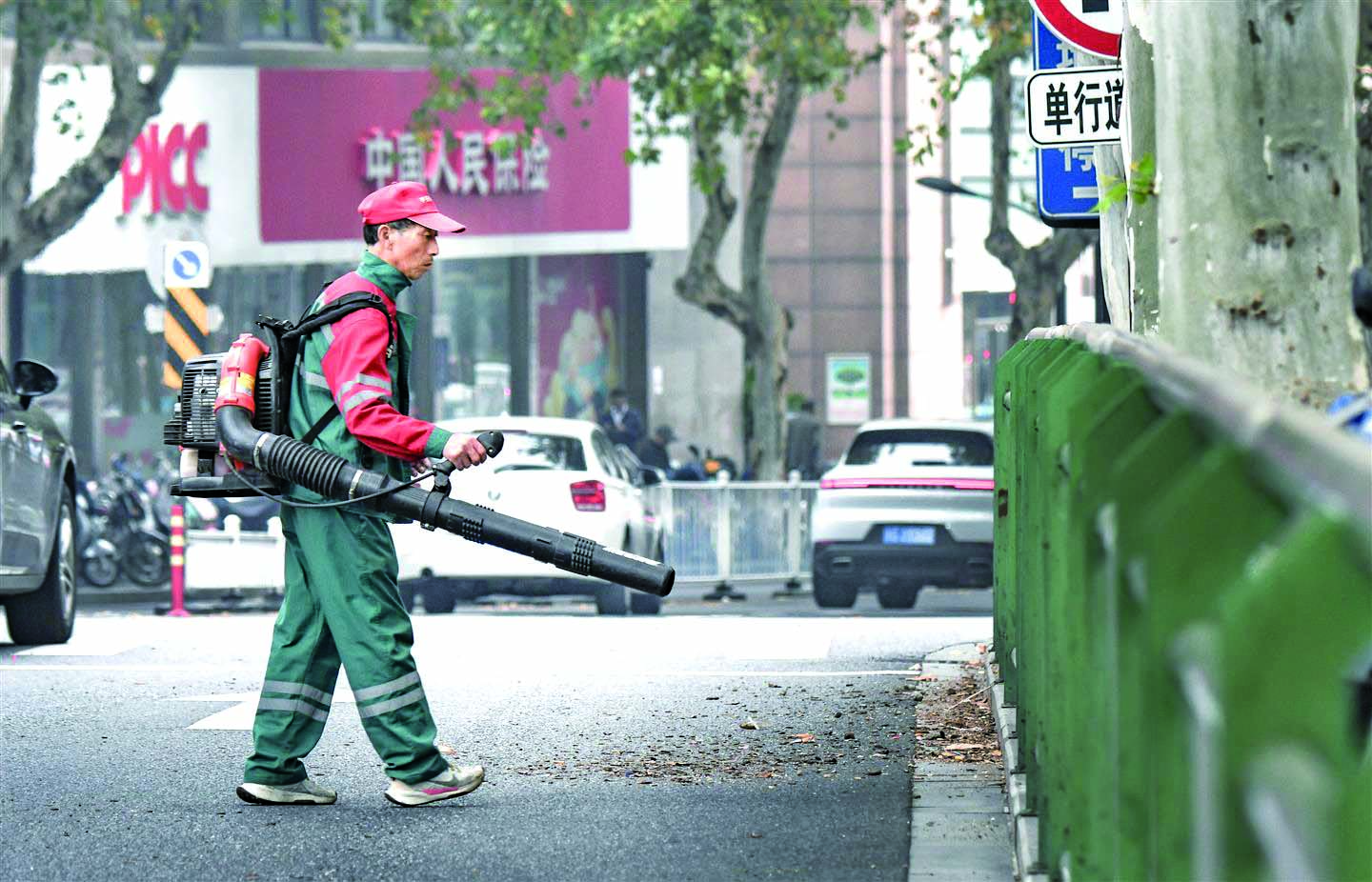连续的阴雨天让街头巷尾的落叶增多,前日在市区中山路上,环卫工人使用鼓风机等设备吹扫落叶,维护市容市貌整洁。 本报记者 李建林 文/摄