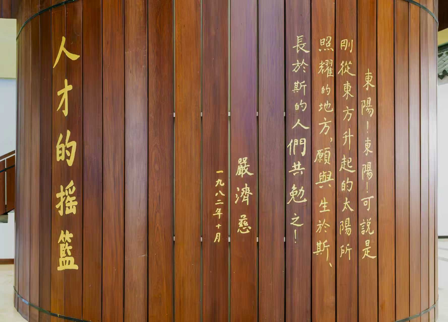 在东阳中学严济慈校友纪念教育展馆,陈列着严济慈的众多珍贵资料。其中一件,就是那一年他回母校作报告时的现场录音,经学校精心保存、转写,以多媒体形式呈现。画面中,讲台简单但隆重,严济慈满面笑容。“其中一位就是潘建伟。”带记者参观的东阳中学党委副书记、副校长吕宇良指着下方听讲的人群介绍。