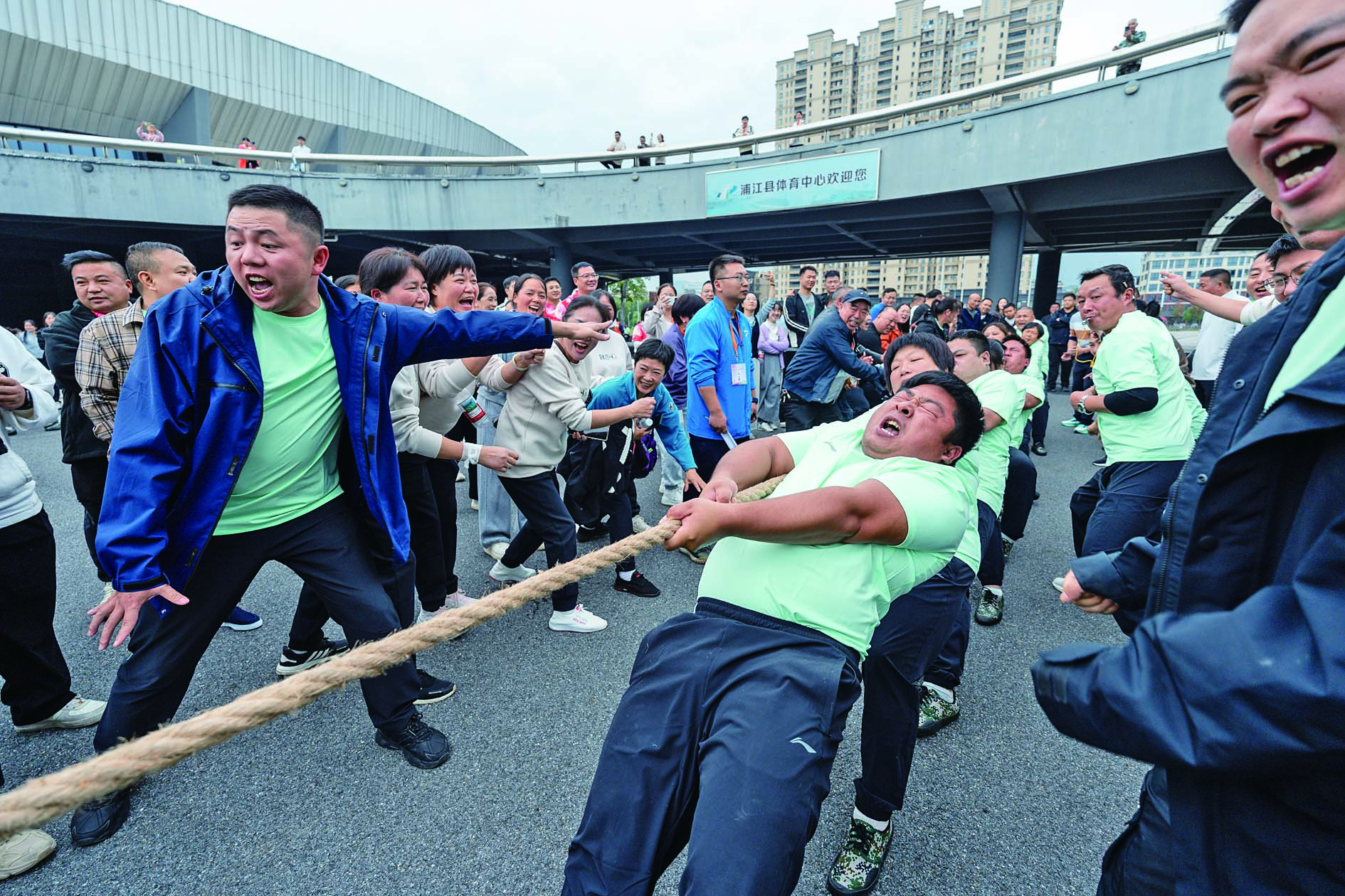 @初心:在一场职工运动会现场,拔河比赛成为全场焦点,运动员们紧握绳索、脚蹬地面,拼尽全力。 楼冀阳 摄