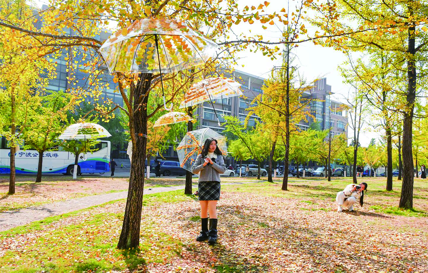 近日,市区一些公园、校园内的银杏树叶陆续“换装”,浪漫的场景吸引不少市民前往休闲游玩,拍照打卡。 本报记者 李建林 文/摄