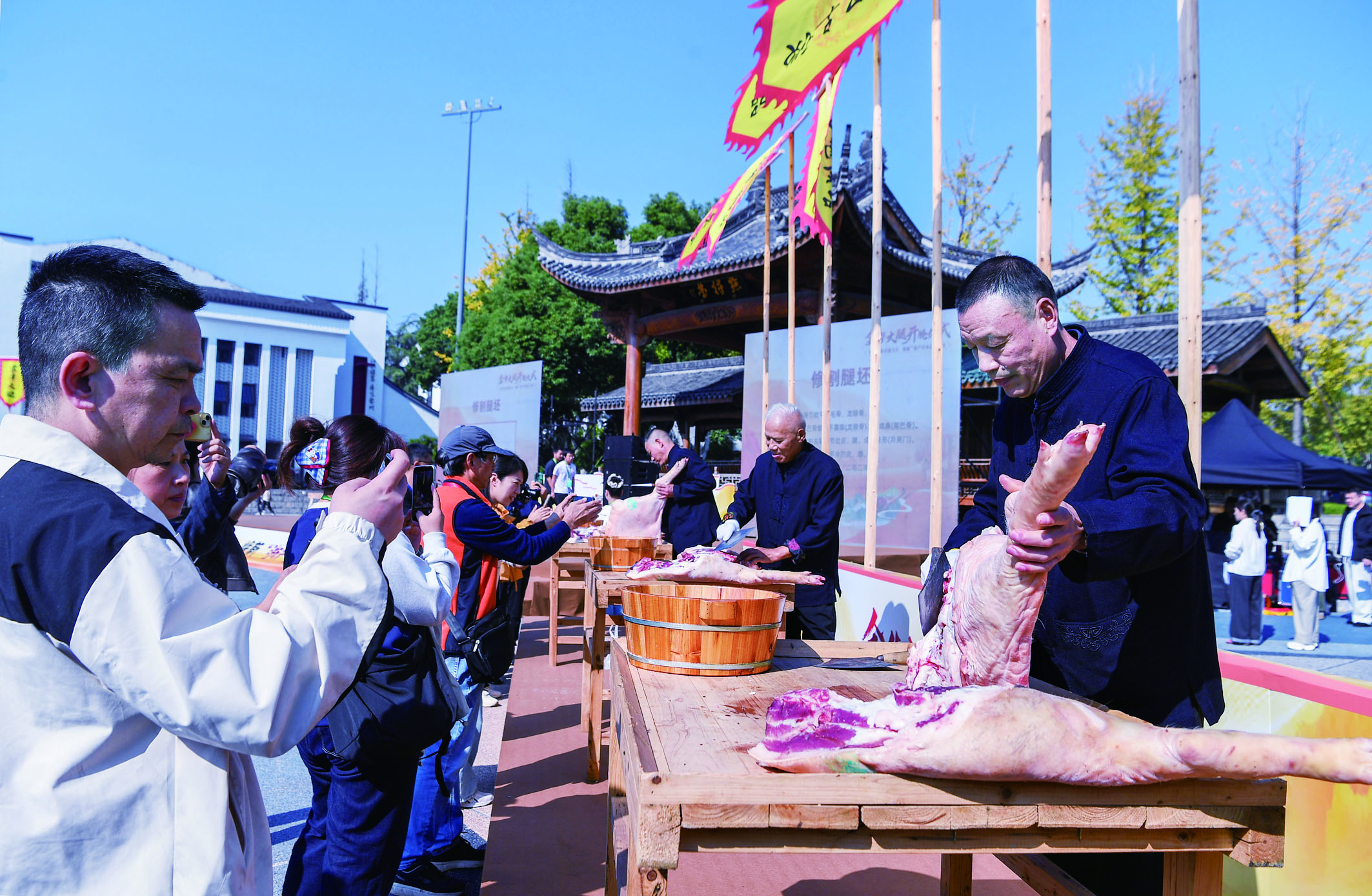 11月16日,金华火腿开腌仪式在市区婺州古城举行,来自我市各家火腿生产企业的技师们,集中展示了腌制技艺中的修胚、上盐等工序,吸引了众多市民前往观看。传统的金华火腿,在农历立冬到次年立春低温节气之间投料腌制,经过上盐、洗晒、整形、发酵、下架、堆叠等多道传统工艺制作而成。 本报记者 时宽兵 摄