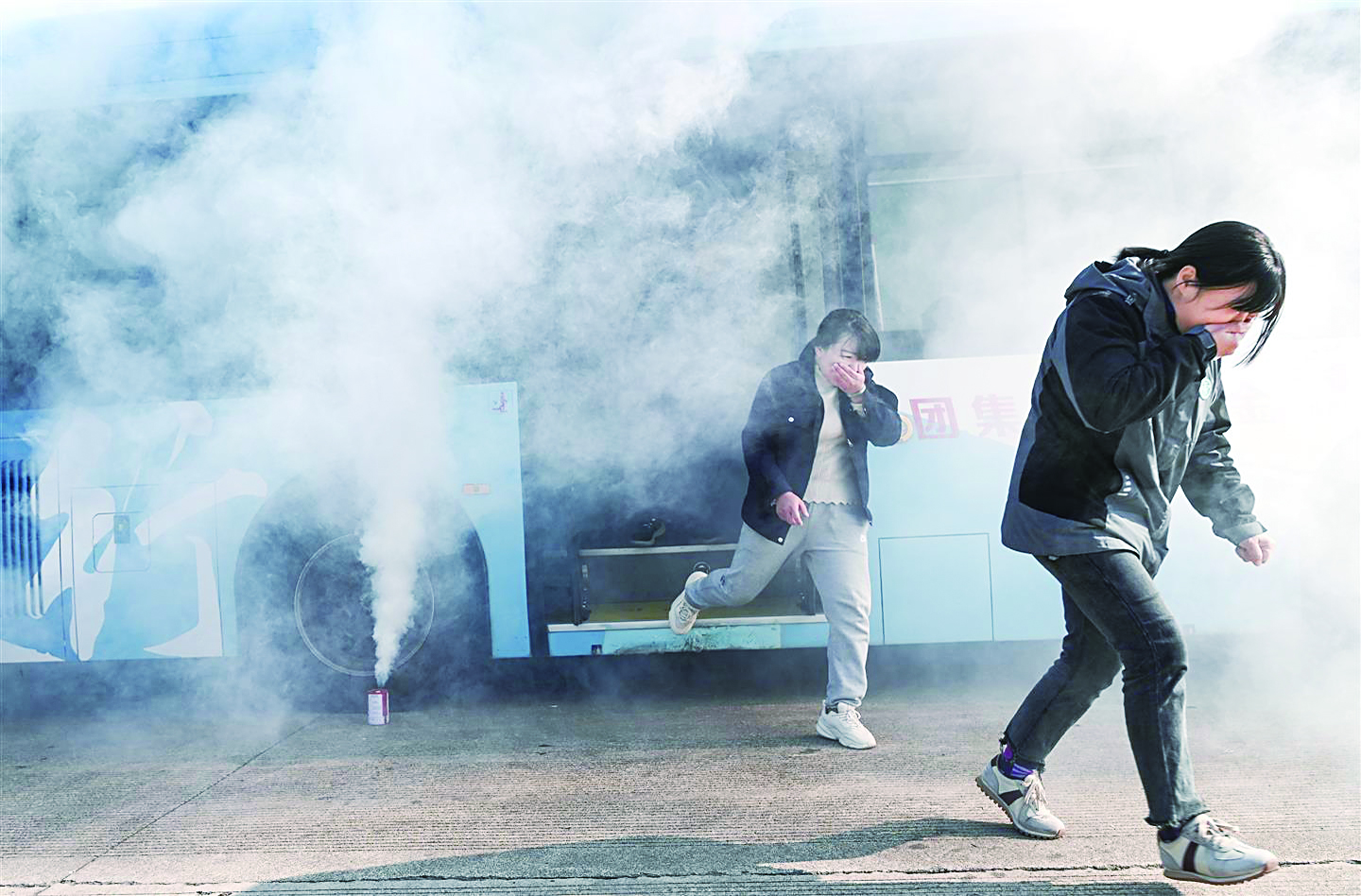 11月20日,市轨交控股公交集团客运金西公司开展突发事件应急逃生演练。 据悉,此次演练涵盖了地震避险疏散、公交应急逃生、医疗救护、事故处置救援等多项内容。 本报记者 李建林 文/摄