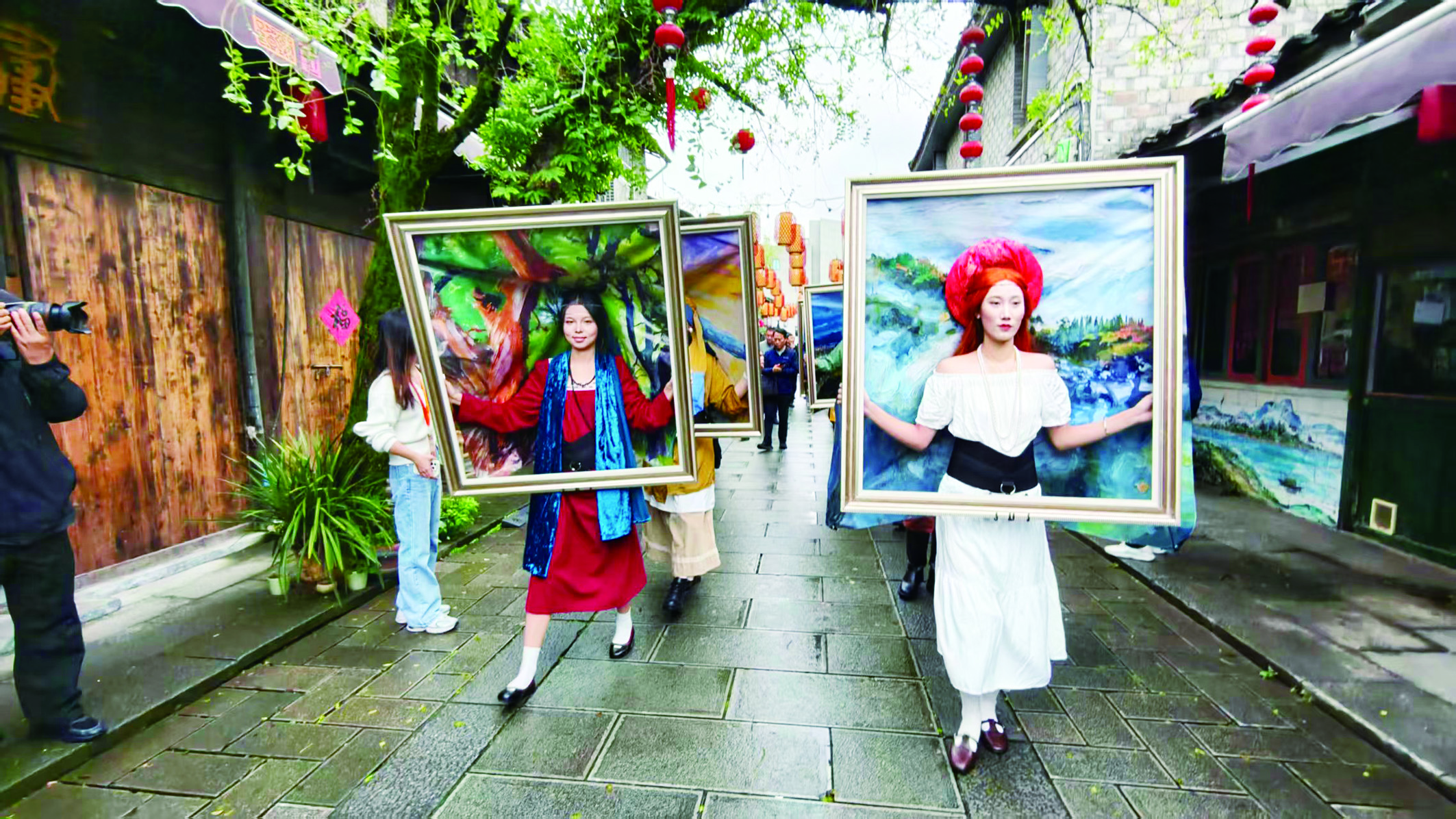 @翩翩:在我市周边一景区的油画主题巡游中,表演人员装扮成油画中人物的形象,举着画框走街串巷,吸引了众多游客拍照。 许毓坚 摄