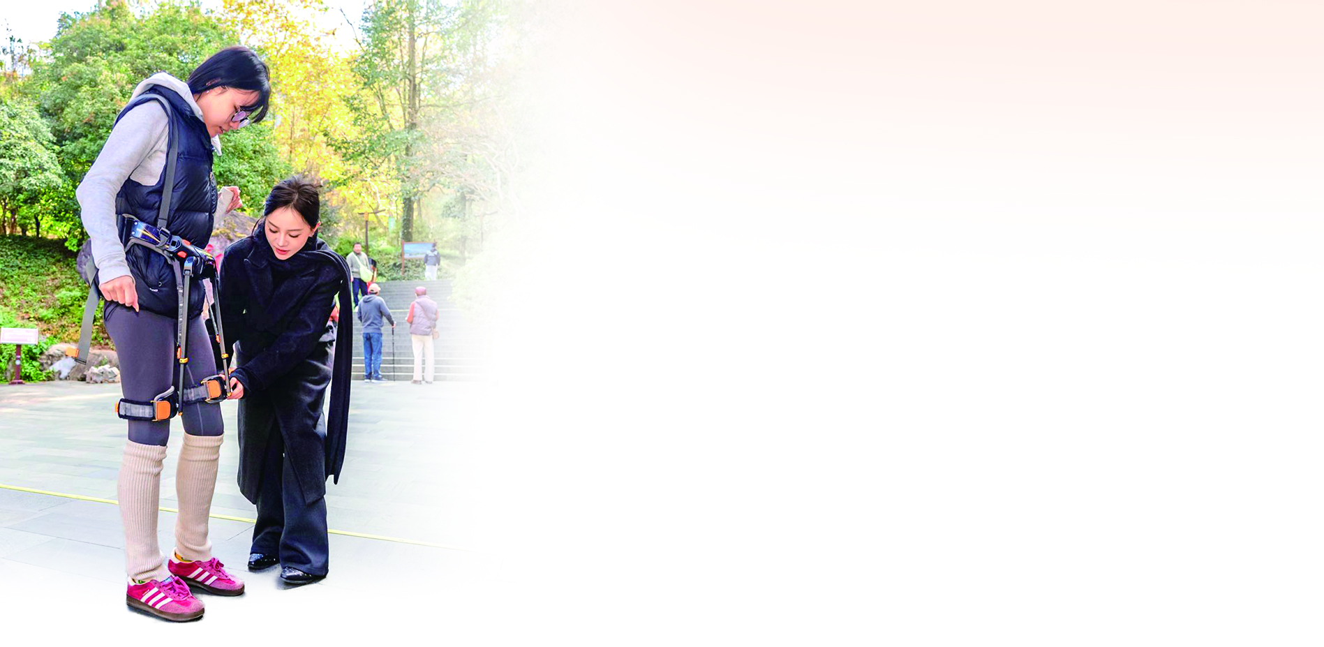我长按开机键,系统提醒“已开机”。穿戴好设备,走上台阶前,我有些紧张和兴奋。走上第一步,感觉胯部和膝盖仿佛被一股轻柔而坚定的力量托起,助推感明显,使我的步伐不自觉迈得更大、走得更快。不仅是在台阶处,即使在平地上行走,也能感受到步幅比平时迈得更大,如同有“隐形助推器”在默默工作。