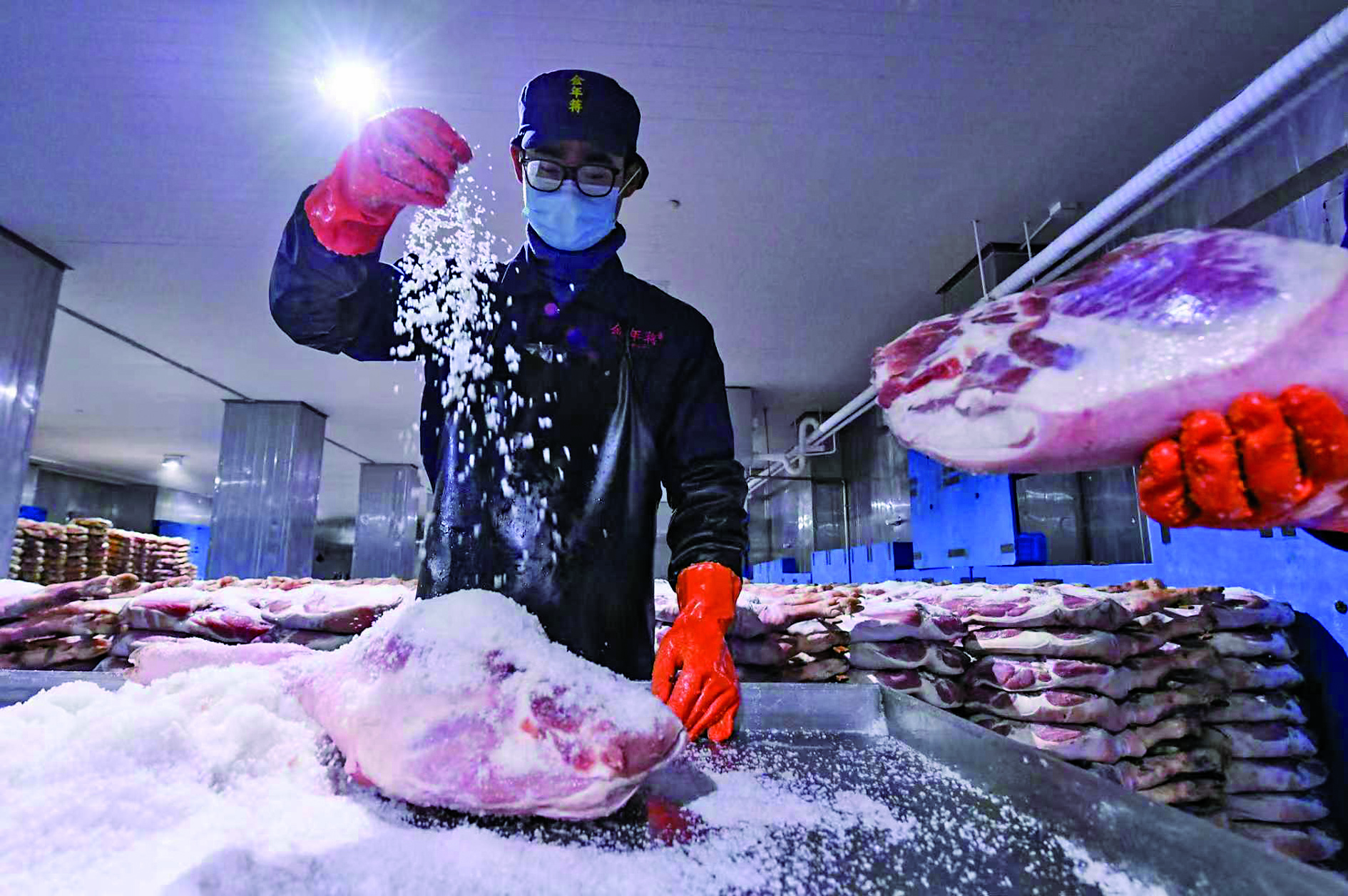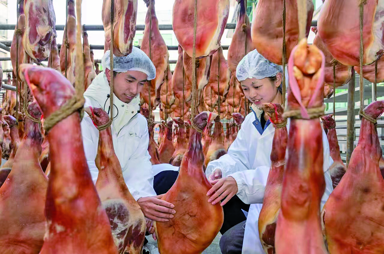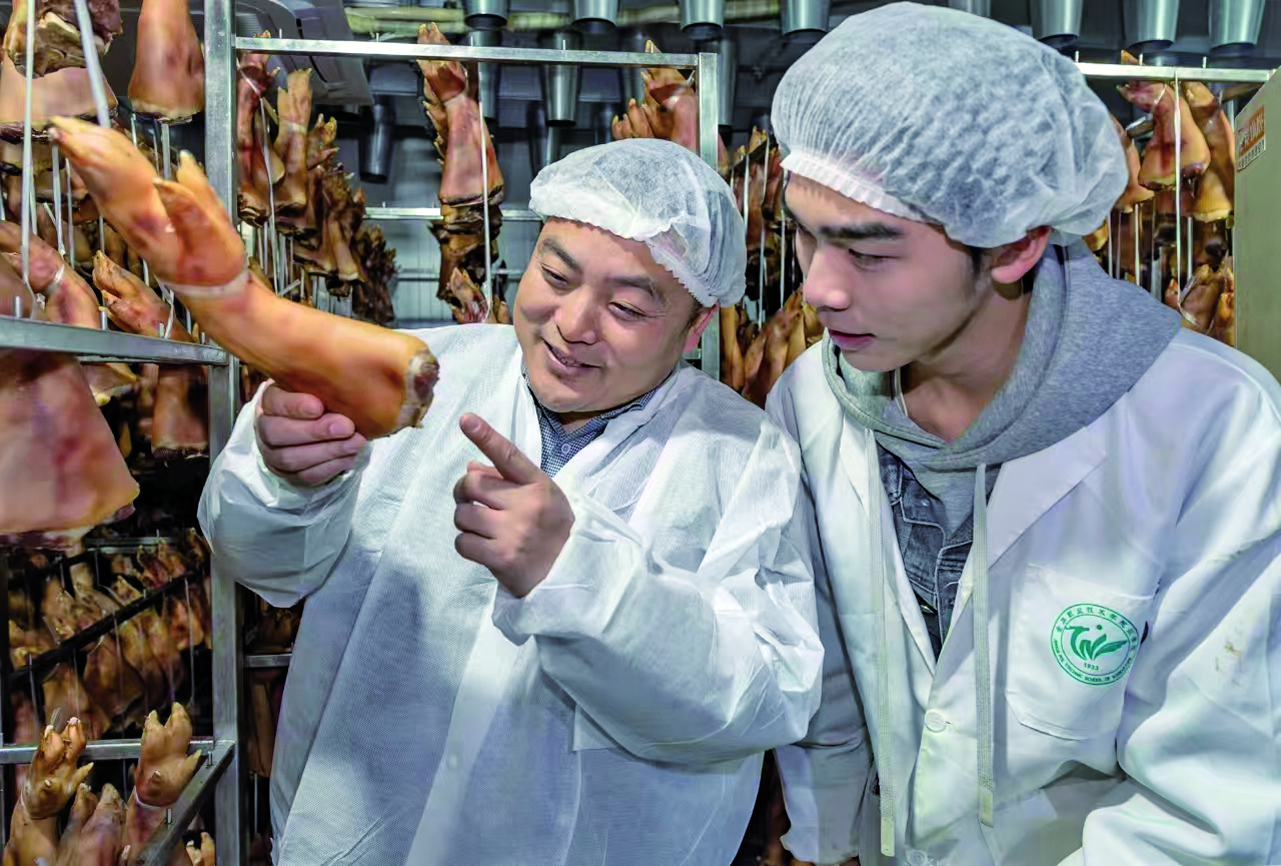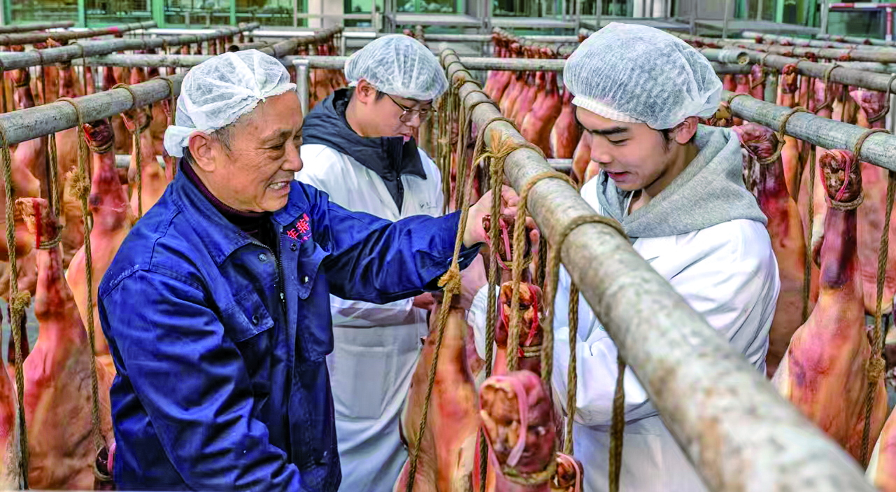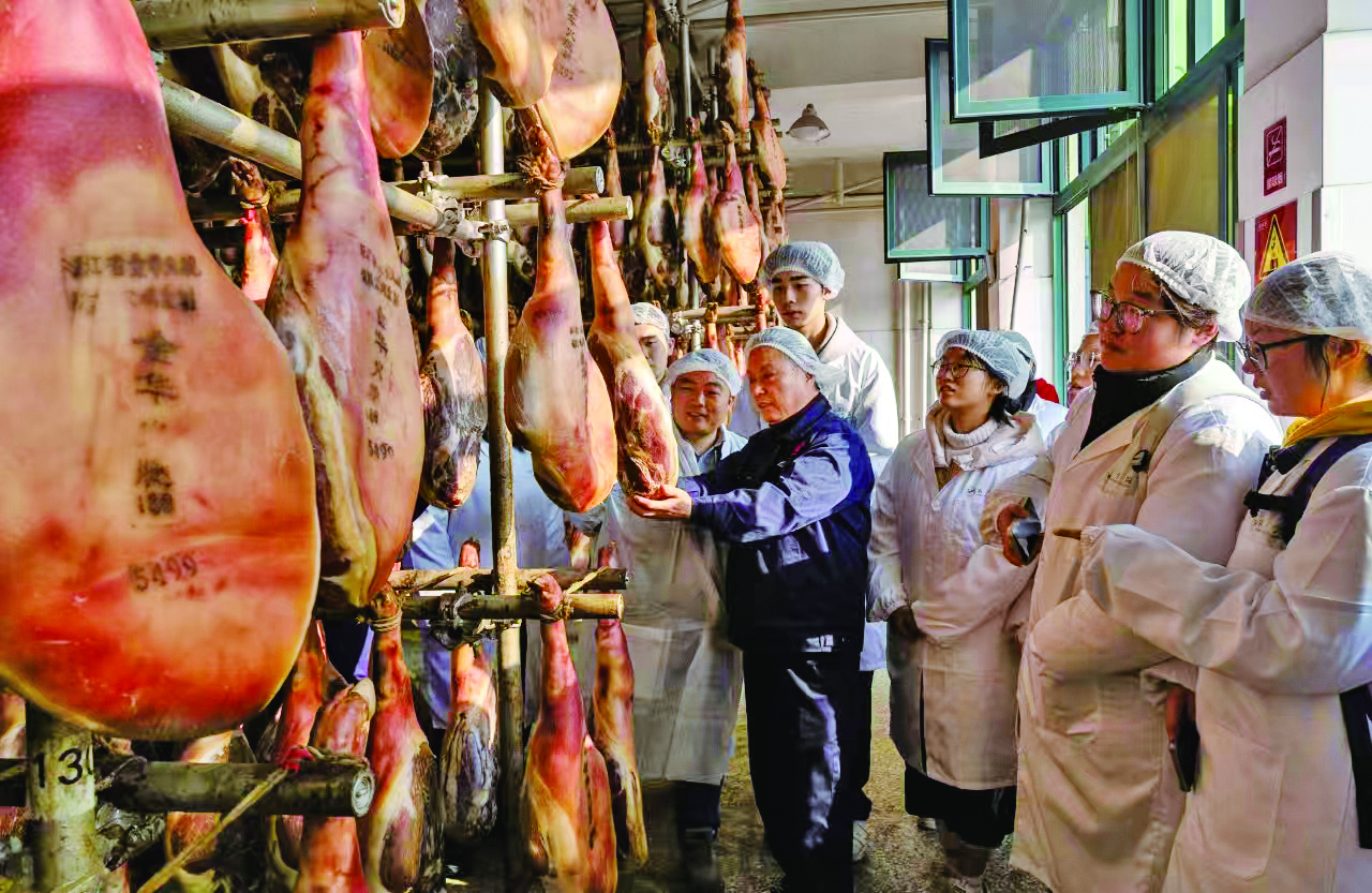 记者采访当天,金华职业技术大学的学生们走进生产车间,跟随生产流程逐步学习,深入体验火腿制作的全过程。