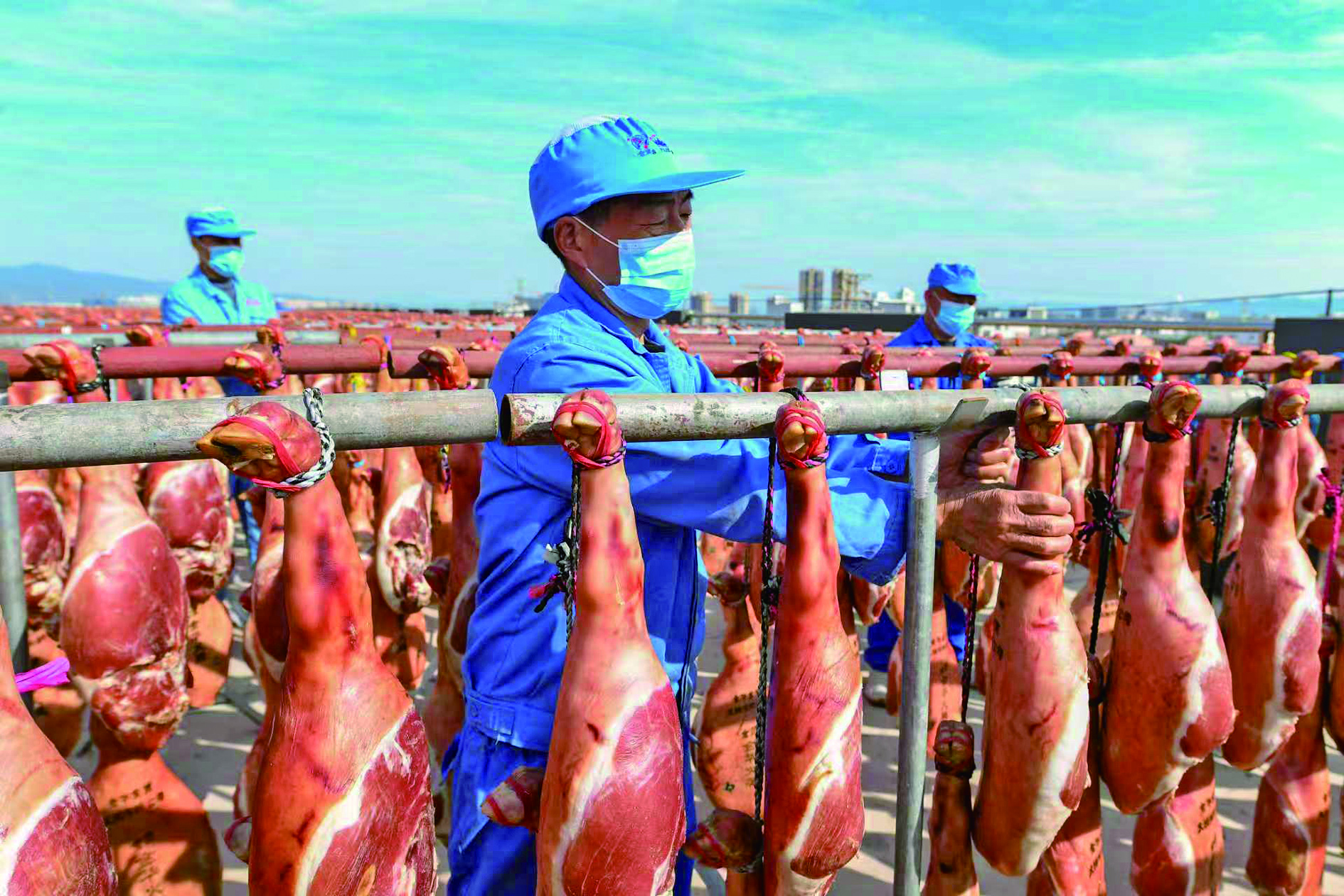 连日晴好,金华火腿迎来加工旺季。在一火腿公司的晒场上,3万余只火腿同时进行“日光浴”。