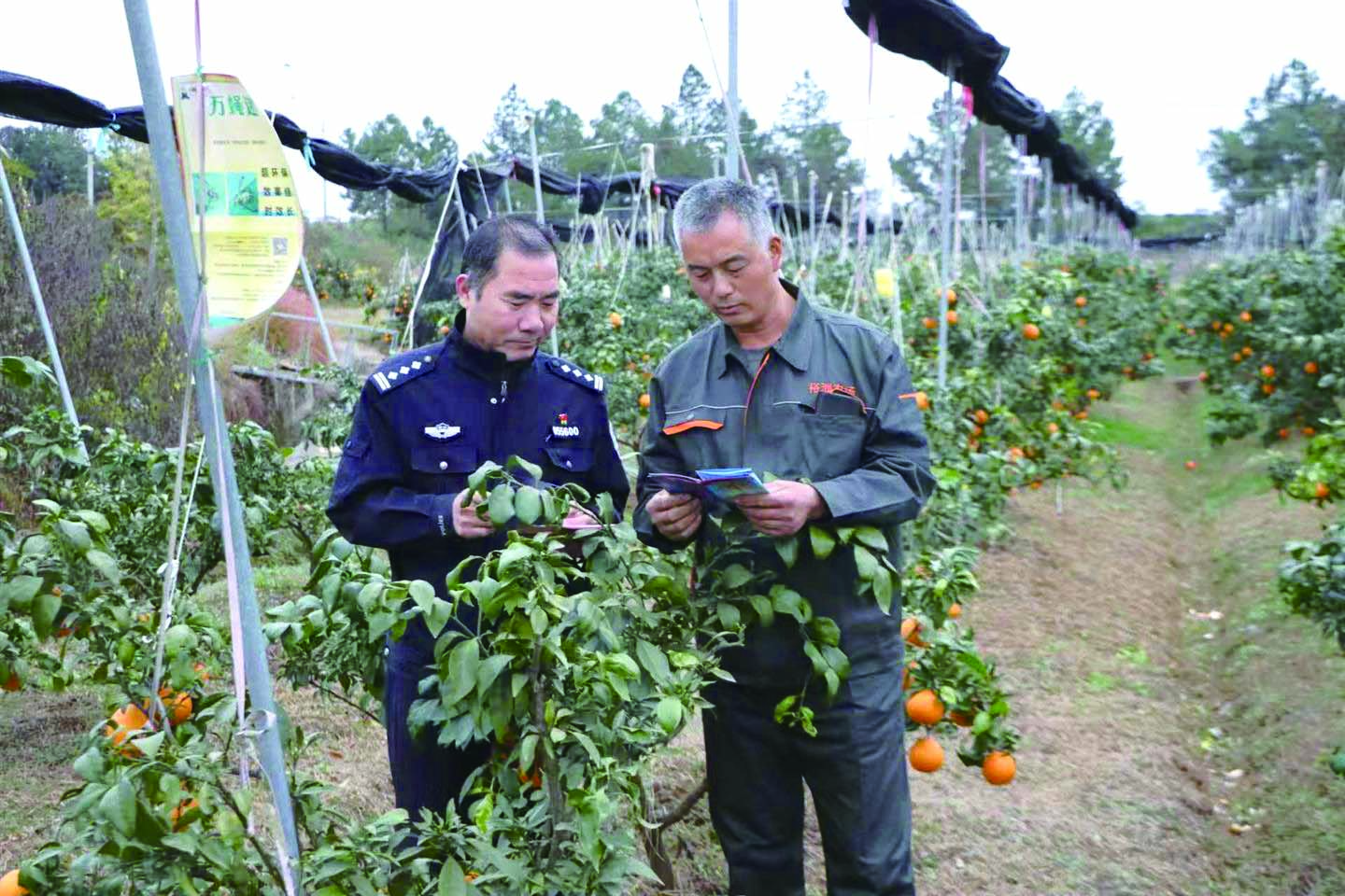 丰收时节,金华市婺城区蒋堂镇红美人种植基地,一颗颗饱满的柑橘挂满枝头。为切实守护这份“甜蜜成果”,金华市公安局婺城分局蒋堂派出所“蒋乐耕”生态服务队深入田间地头,持续开展“护果”行动,把平安与服务送到果园一线。图为生态警长带队在果园开展生态服务。 陈美青 摄