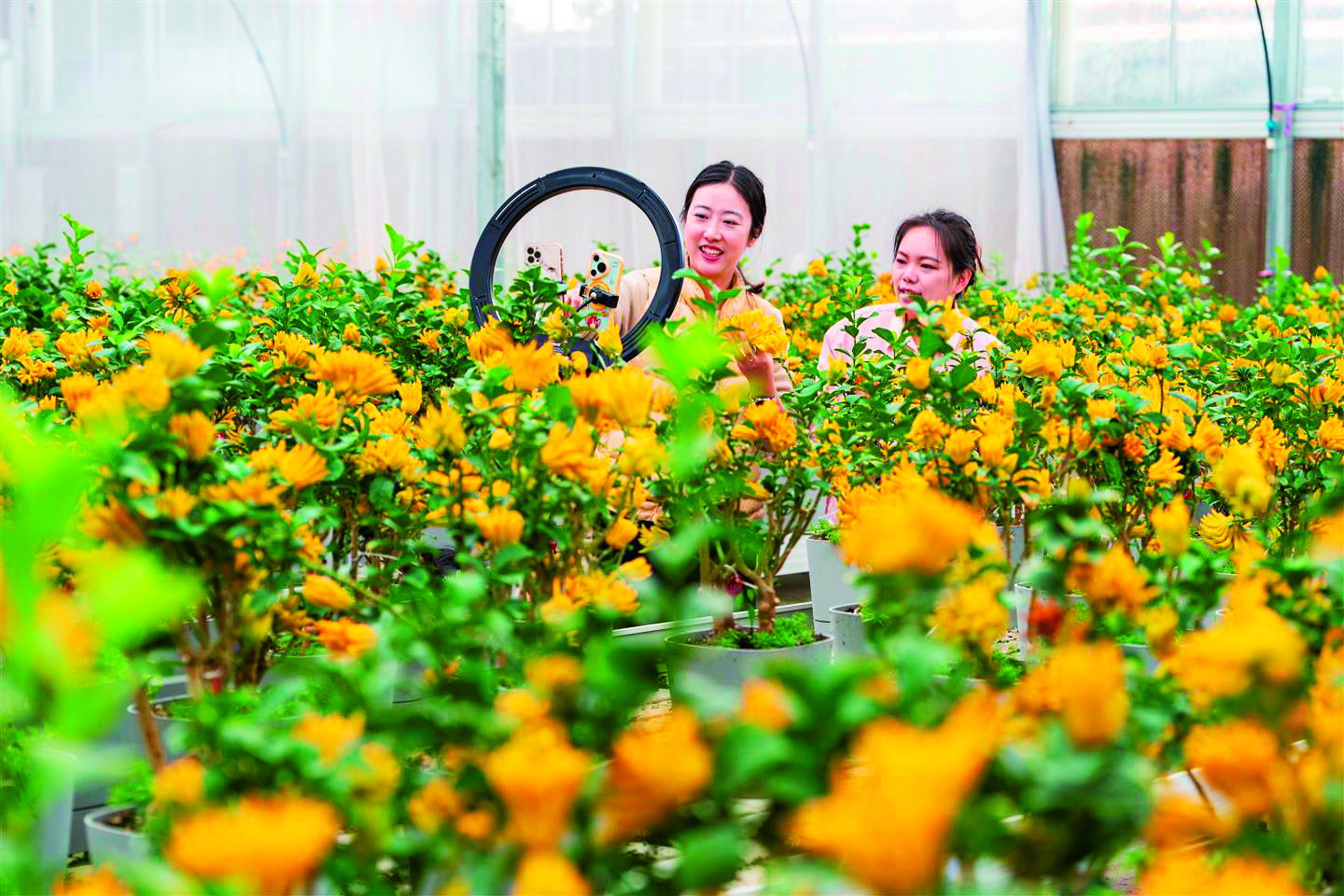 昨日,金东区北山口村的佛手种植大棚内,新农人陈思捷正在直播售卖佛手产品。自2021年起,北山口村组建强村公司,通过开发佛手丝、佛手蜜、佛手香薰、佛手茶饮等深加工产品,提升附加值,角逐新市场。 本报记者 陈业 摄