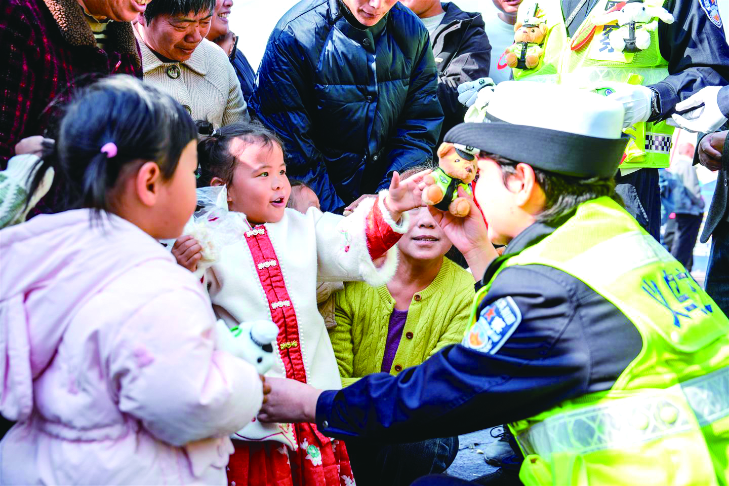 12月1日,义乌市公安局交警大队开展形式多样的交通主题宣传活动。图为民警向小朋友赠送交通安全主题纪念品。 郑圻冬 摄
