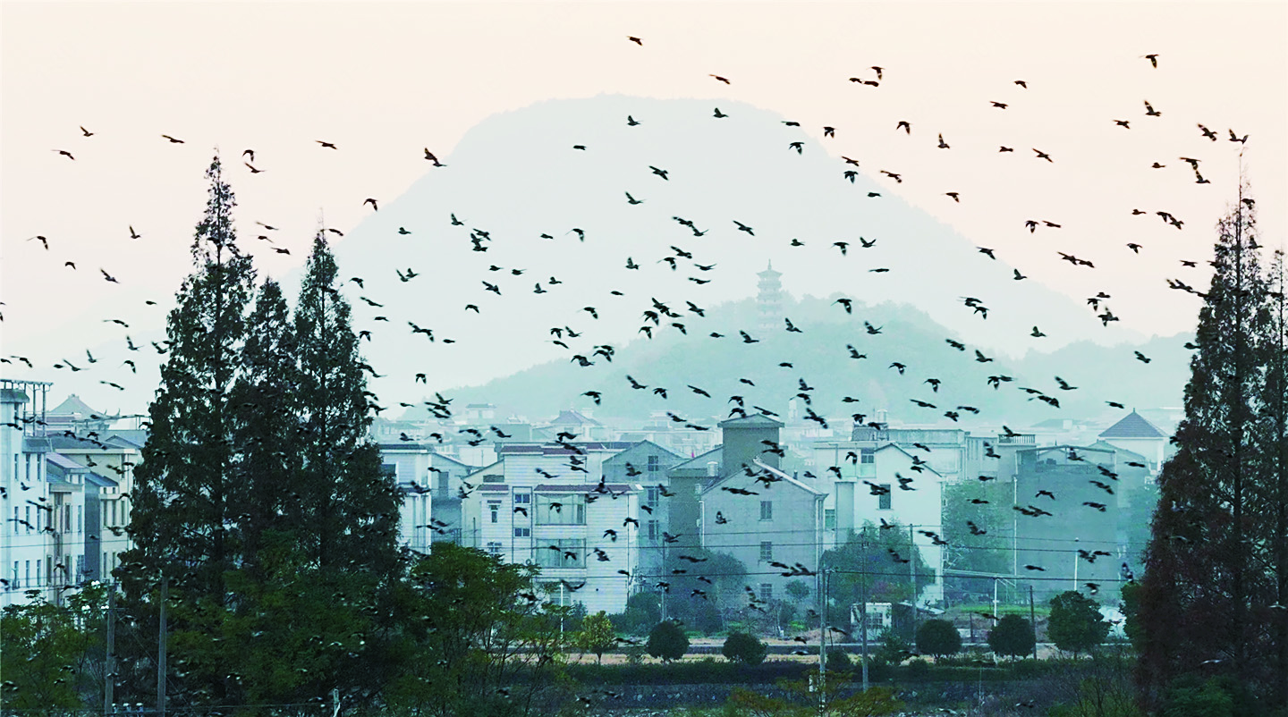 为何秋冬时节东阳会迎来这般鸟群奇观?叶铎揭秘了丝光椋鸟的“越冬秘诀”:“它们是天生的‘群居爱好者’,夏天分散在各地繁殖觅食,一到秋冬就开始‘抱团取暖’。”这类鸟儿分为留鸟和迁徙鸟,留鸟常年扎根本地,迁徙鸟则从北方千里南飞,眼下正是迁徙种群集中归巢的时节。近年来,这种“空中鸟浪”景象在浙中地区愈发常见,成为冬日里独特的生态风景。